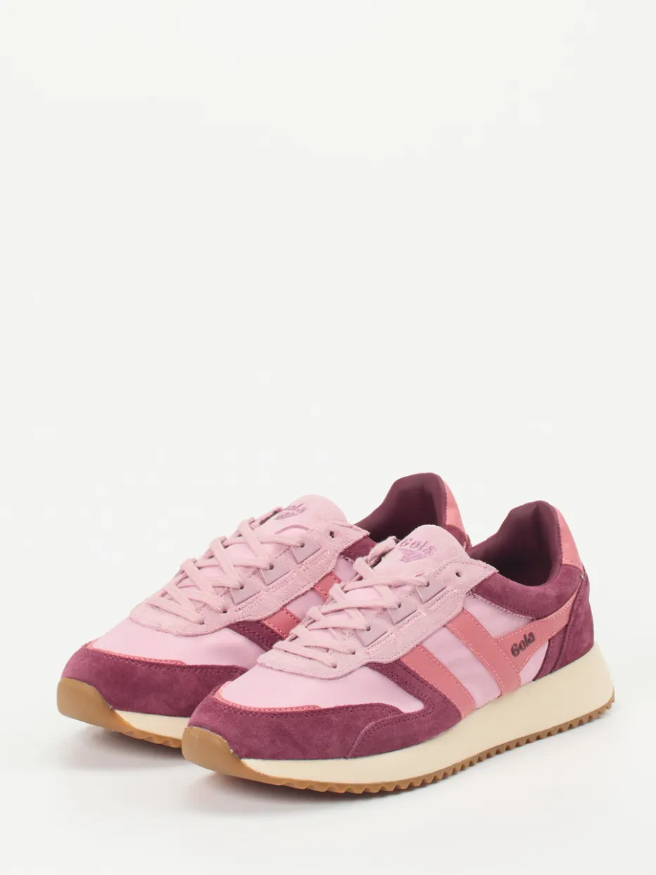 Rosé trifft Retro-Charme.Der Retro-Sneaker von Gola bringt Streetwear-Ästhetik in die Damenmode. Mit seiner klassischen Runner-Form greift er den Vintage-Trend der 90er auf. Die Kombination aus weichem Veloursleder und beerenfarbenem Nylon erzeugt einen spannenden Materialkontrast. Die nuancierte Farbgebung in Rosé, Hellrosa und Beerenrot wird durch seitliche Streifen und Ton-in-Ton-Branding stilvoll akzentuiert. Die strukturierte Gummisohle sorgt für Komfort bei Alltag, Freizeit oder Urlaub. Angesagt: Color-Blocking in Pastelltönen – perfekt zu hellen Denim-Styles oder soften Sweatjacken. Ein modischer Allrounder mit Gola-typischem Streetstyle-Flair.