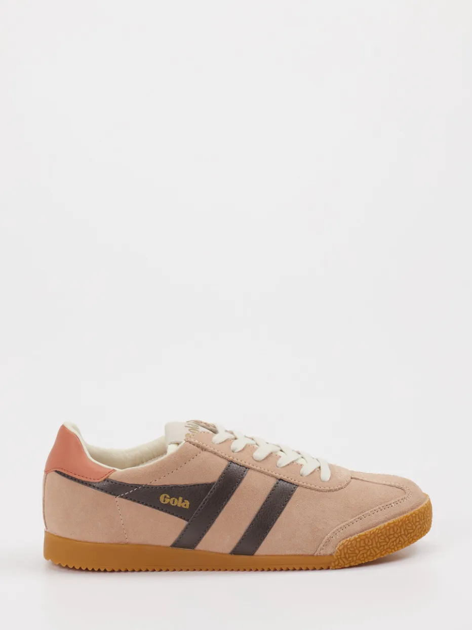 Ideal für entspannte Freizeitmomente und stylische Streetwear-Outfits: Der Sneaker kombiniert rosébeige Veloursleder-Oberflächen mit einer flachen, schmalen Silhouette und goldfarbenen Logodetails. Dunkelbraune Kontraststreifen und ein terrakottafarbener Fersenpatch setzen gekonnte Designakzente, während die griffige Gummisohle sportlichen Komfort bietet. Die Schnürung sorgt für sicheren Halt, das Textilfutter für angenehmes Tragegefühl. Im Trend mit dem Retro-Runner-Look und Color-Blocking-Elementen. Lässt sich besonders gut zu weißen T-Shirts oder Canvas-Rucksäcken kombinieren.