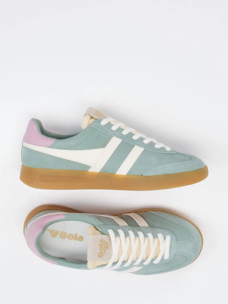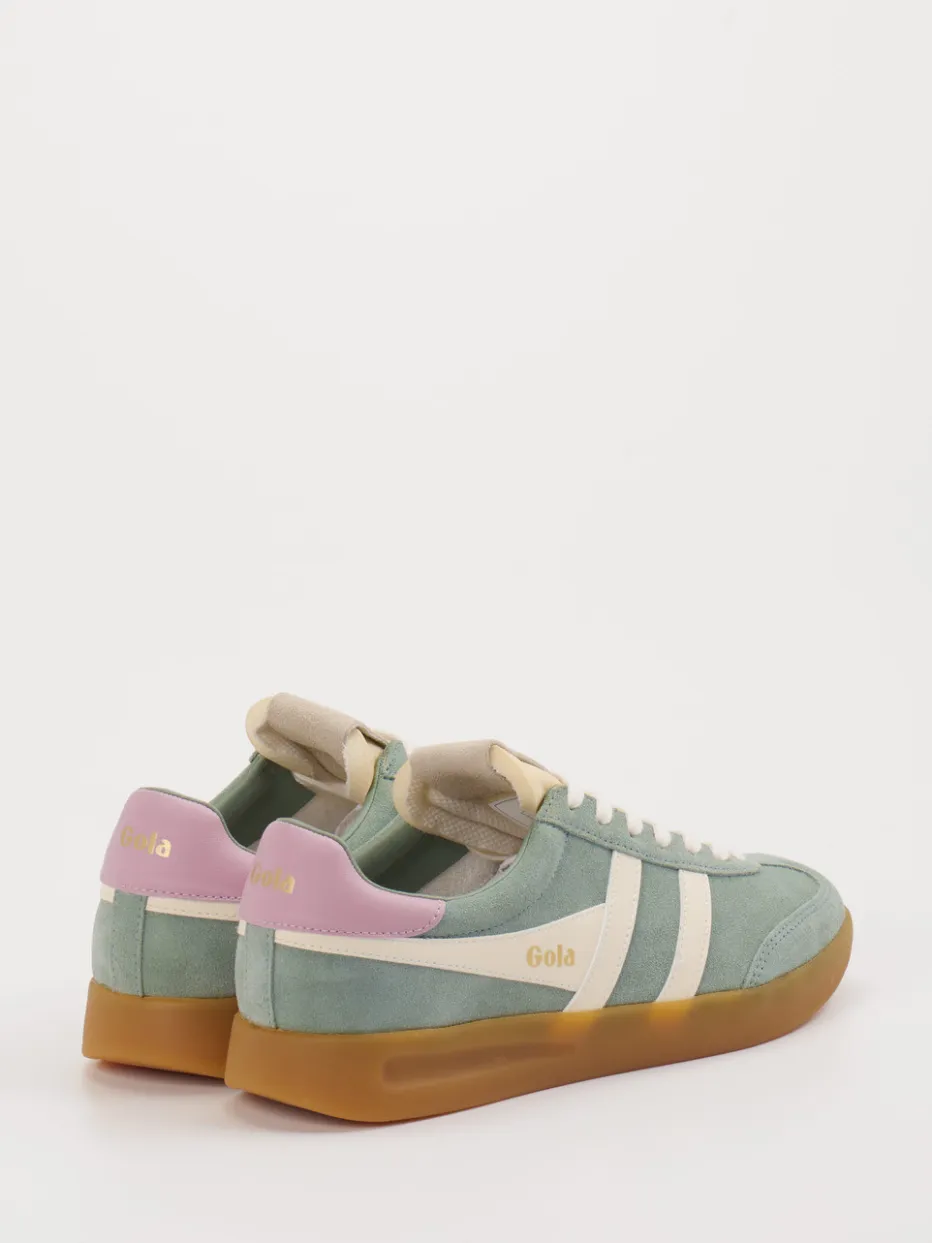 Der Retro-Sneaker von Gola verbindet Veloursleder in Salbeigrün mit pastelligen Akzenten und klassischem Design – ideal für entspannte Streetwear-Looks mit Charisma.