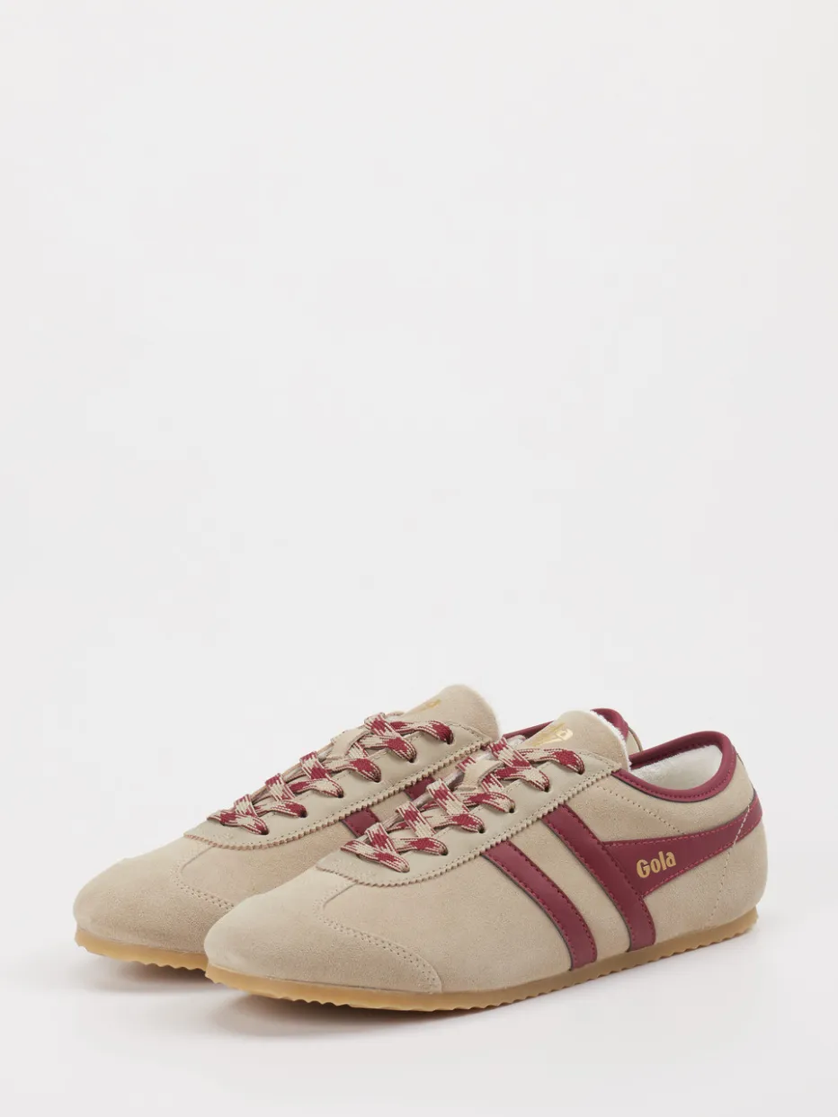 Vintage-Flair mit urbanem Twist. Gola präsentiert diesen Retro-Sneaker für Damen, gefertigt aus hochwertigem Veloursleder. Ob zum Spaziergang durchs Viertel oder bei lockeren Freizeitaktivitäten – das flach-schmale Modell im warmen Beigeton setzt mit bordeauxroten Streifen und zweifarbiger Schnürung markante Akzente. Die matte Oberfläche unterstreicht den Retro-Charme, während das Fischgrätprofil der Gummisohle für Grip sorgt. Textilfutter und die Option für Einlagesohlen erhöhen den Tragekomfort. Inspiriert von 90s-Streetwear, trifft er den aktuellen Color-Blocking-Trend. Funktionales Design mit modischer Aussagekraft – typisch Gola.