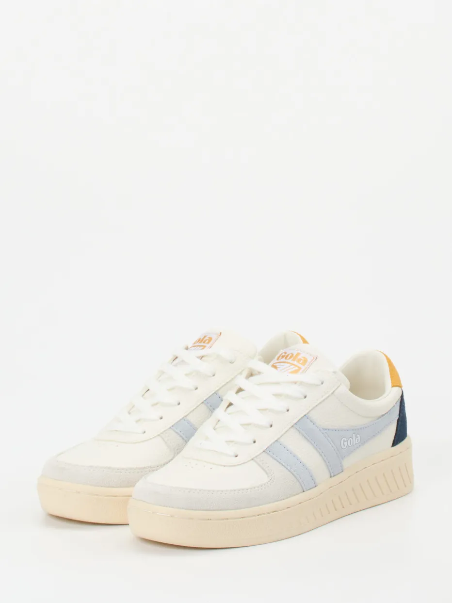 Trendfarben neu interpretiert.Gola präsentiert mit diesem Sneaker ein Modell der Kategorie Retro-Sneaker mit Vintage-Charakter. Für urbane Freizeitmomente mit modischer Aussage bietet das Obermaterial aus Glattleder samt Veloursleder-Applikationen eine harmonisch strukturierte Oberfläche. Das Offwhite-Grunddesign wird durch hellblaue, navyfarbene und senfgelbe Details dynamisch akzentuiert. Schnürung, genarbte Textur und ein kremiger Gummiboden sorgen für Stil und Komfort – ergänzt durch verstärkte Fersenelemente und orangefarbene Logos. Das leder- und textilgefütterte Innenleben sichert ein angenehmes Tragegefühl. Stilistisch verankert in den aktuellen 90s- und Streetwear-Trends, überzeugt der Schuh im Color-Blocking-Look. Unisex-Sneaker mit klarer Formsprache und trendorientierter Ausstrahlung.