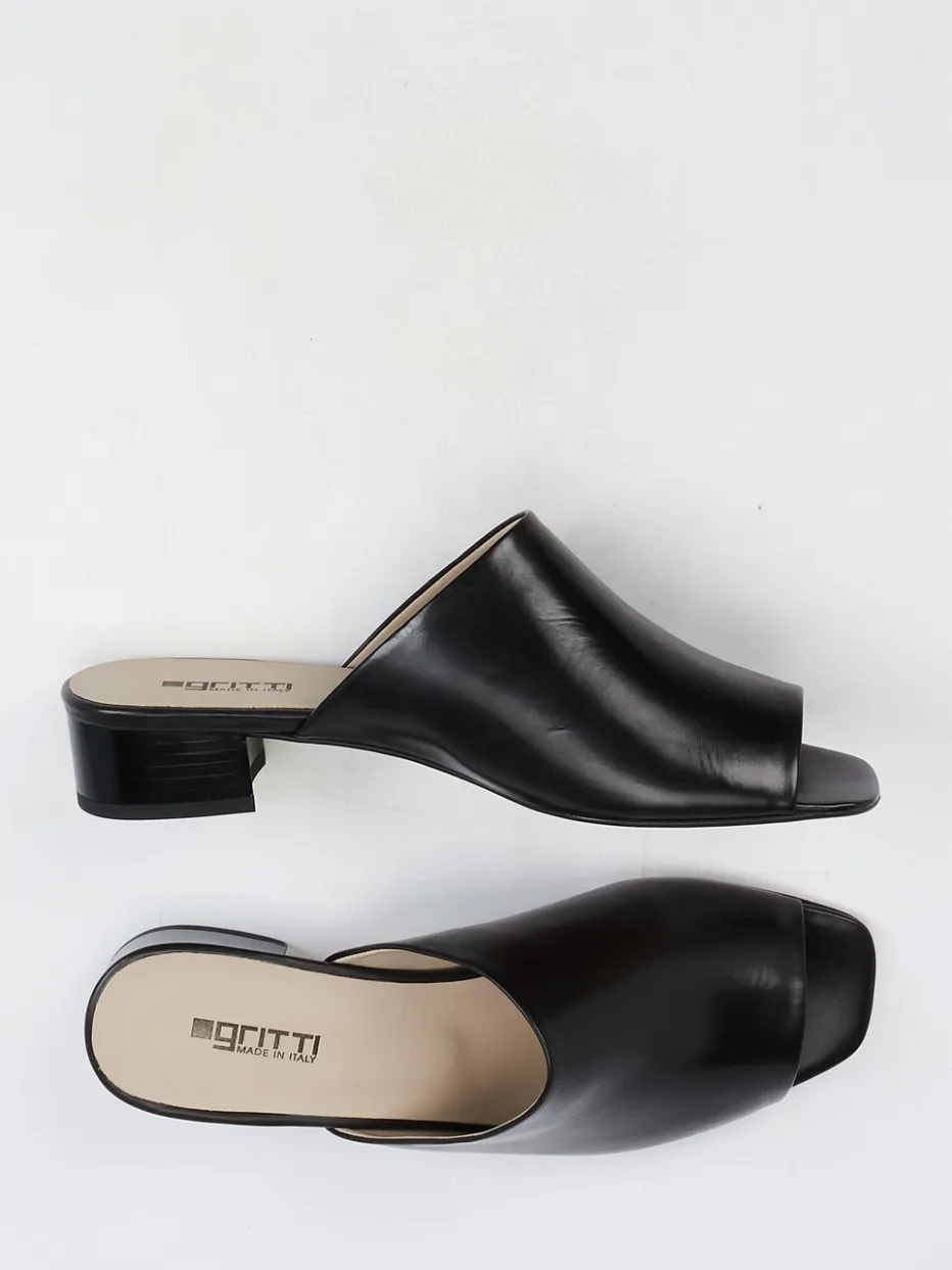 Gritti interpretiert klassische Mules auf moderne Weise. Die schwarze Pantolette für Damen überzeugt durch klares Design und eine komfortable Passform.