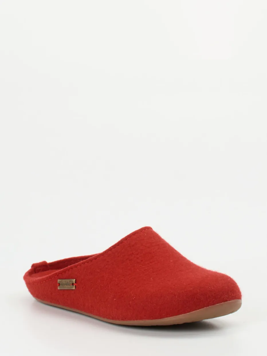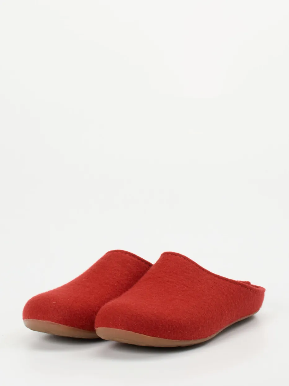 Ideal für gemütliche Stunden zu Hause bietet der geschlossene Vorderfuß mit offener Ferse ein einfaches Hineinschlüpfen. Die reine Schurwolle in Wollfilz-Qualität wirkt klimaregulierend – wärmt und lässt dennoch die Füße atmen. Das intensive Tomatenrot bringt stilvollen Akzent in jede Loungewear, das kleine Metall-Label setzt einen feinen Markenhinweis. Ergonomisches Fußbett und eine profilierte Gummisohle sorgen für sicheren Halt, selbst beim kurzen Gang nach draußen. Inspiriert vom skandinavischen Minimalismus.