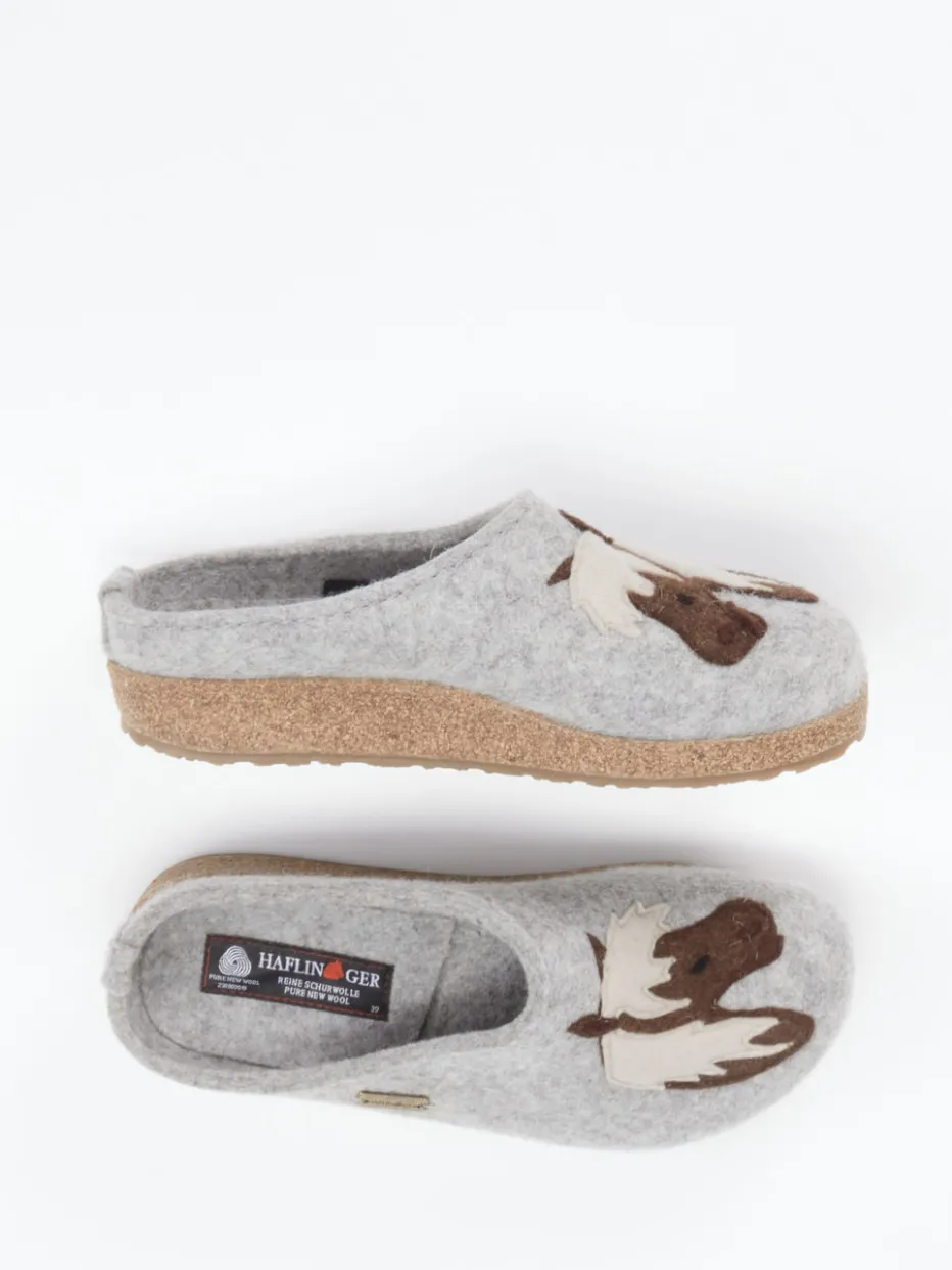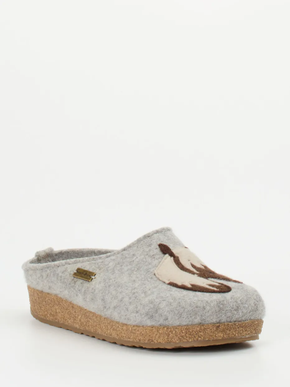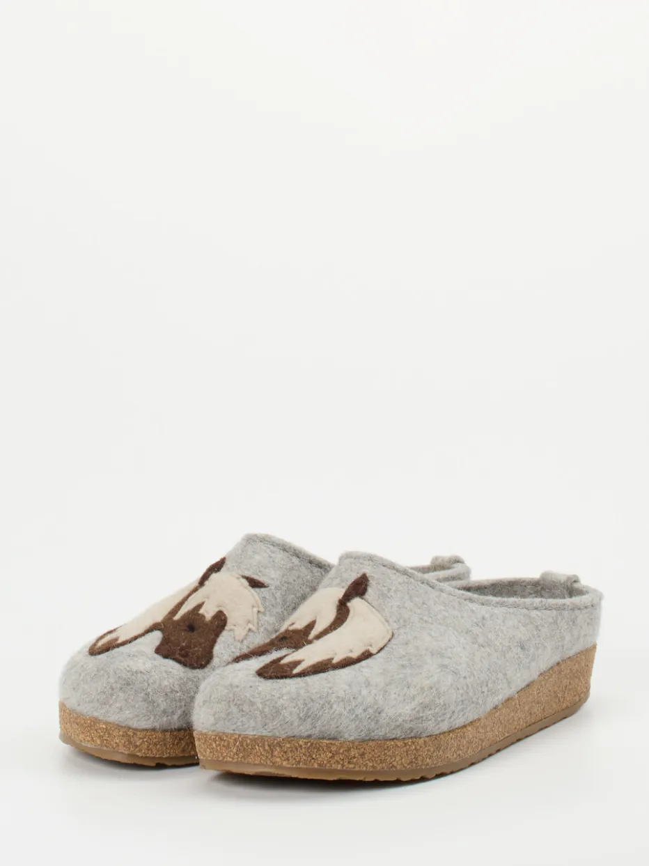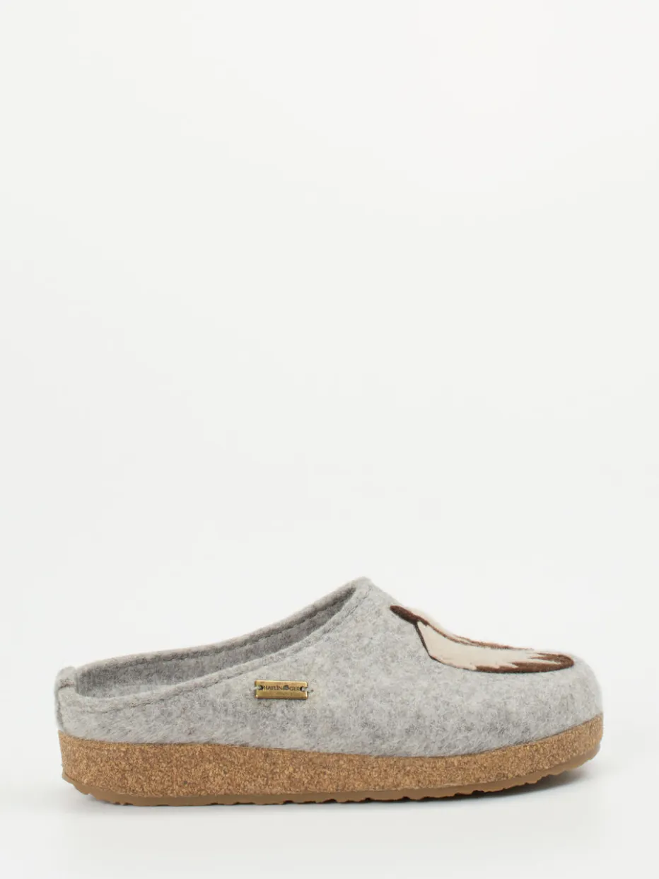 Wärme trifft Natürlichkeit.Der Hausschuh von Haflinger bietet gemütliche Wärme für zuhause oder das Wochenende in den Bergen. Hergestellt aus hellgrauer, filziger Schurwolle, hält der geschlossene Pantoffel angenehm warm, ohne zu überhitzen. Das ergonomisch geformte Kork-Latex-Fußbett bietet Halt und Komfort, während die mit Gummibesatz profilierte Sohle zuverlässigen Grip sichert. Punktuell akzentuiert mit Tiermotiv-Applikation und seitlichem Markenbadge in Metalloptik, unterstützt das Modell den Cottagecore-Trend. Ideal kombinierbar mit Loungewear oder dicken Wollsocken. Natürlich wärmend mit alpiner Seele – Haflinger-Komfort für jeden Tag.