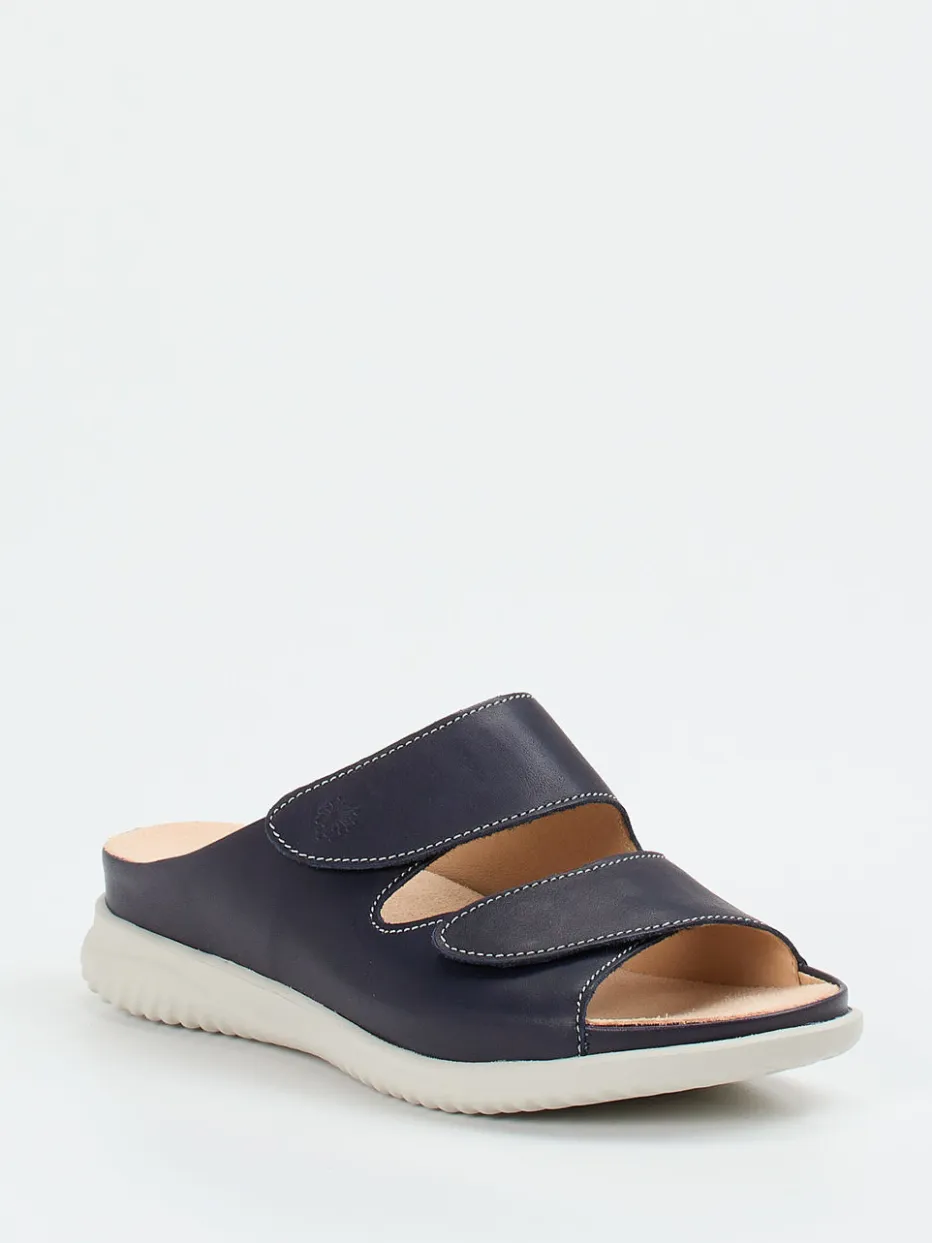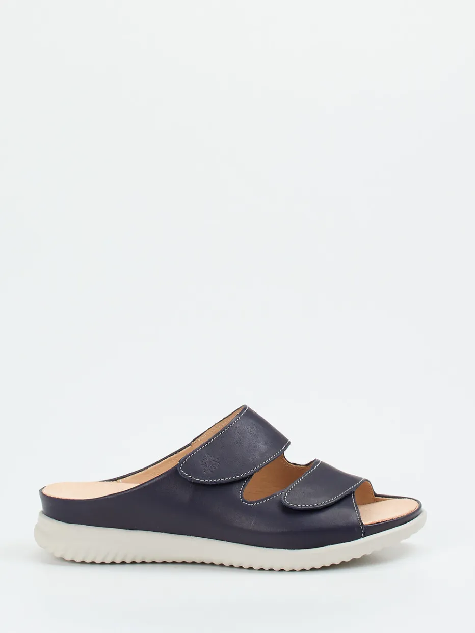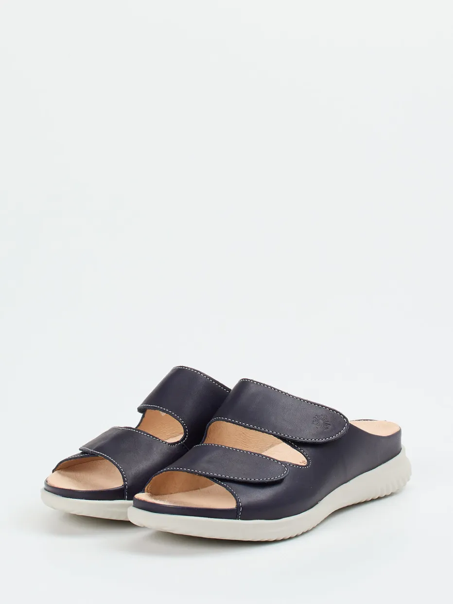 Maritimer Komfort für entspannte Alltagsmomente.Hartjes präsentiert diese bequeme Damen-Pantolette aus der Linie Breeze. Ob für einen kurzen Spaziergang oder zum Relaxen daheim – das weiche, mattes Kalbleder in Dunkelblau mit weißen Kontrastnähten sorgt für sportiv-frische Akzente. Das herausnehmbare, komfortabel lederbezogene Korkfußbett ist ergonomisch geformt und bietet gemeinsam mit der extraleichten, cremeweiß profilierten Gummisohle idealen Halt. Zwei breite Klettverschlüsse ermöglichen eine individuelle Passform. Der offene, ergonomische Schnitt trifft den Trend funktionaler Leichtigkeit im Sommer 2024. Markentypische Bequemlichkeit in stilvoller Verarbeitung – für Alltag mit Anspruch.