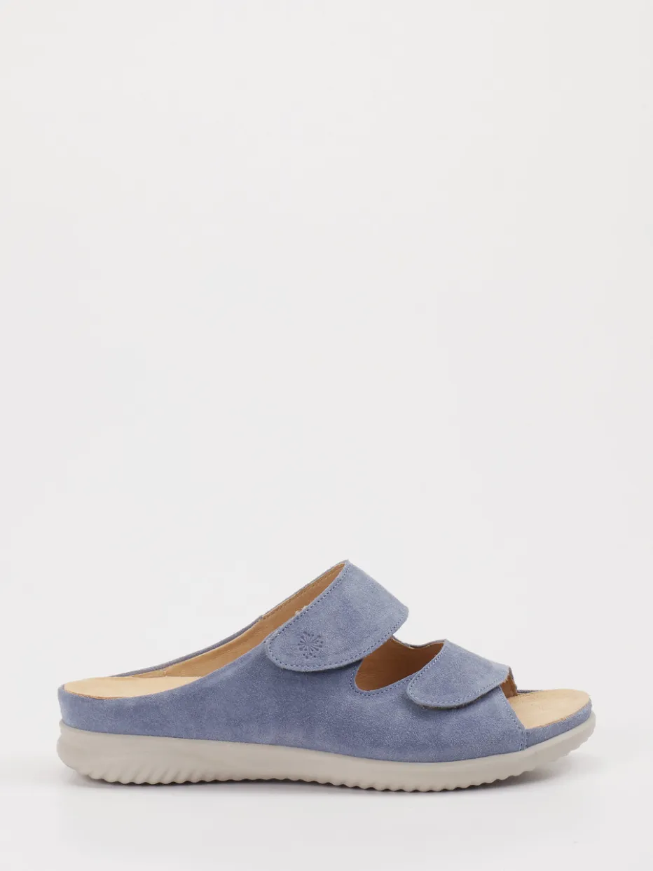Das jeansblaue Veloursleder mit weicher, aufgerauter Oberfläche verleiht dem Schuh ein angenehm sommerliches Tragegefühl. Zwei verstellbare Klettverschlüsse ermöglichen individuelle Anpassung, während die profilierte Synthetiksohle sicheren Halt auf verschiedenen Untergründen bietet. Das ergonomische Fußbett fördert natürlichen Laufkomfort – ideal für Freizeit und Zuhause. Dezente Ton-in-Ton-Nähte und eine subtile Markenprägung sorgen für ein zurückhaltendes Design. Besonders harmonisch zu lässigen Baumwollhosen kombinierbar.