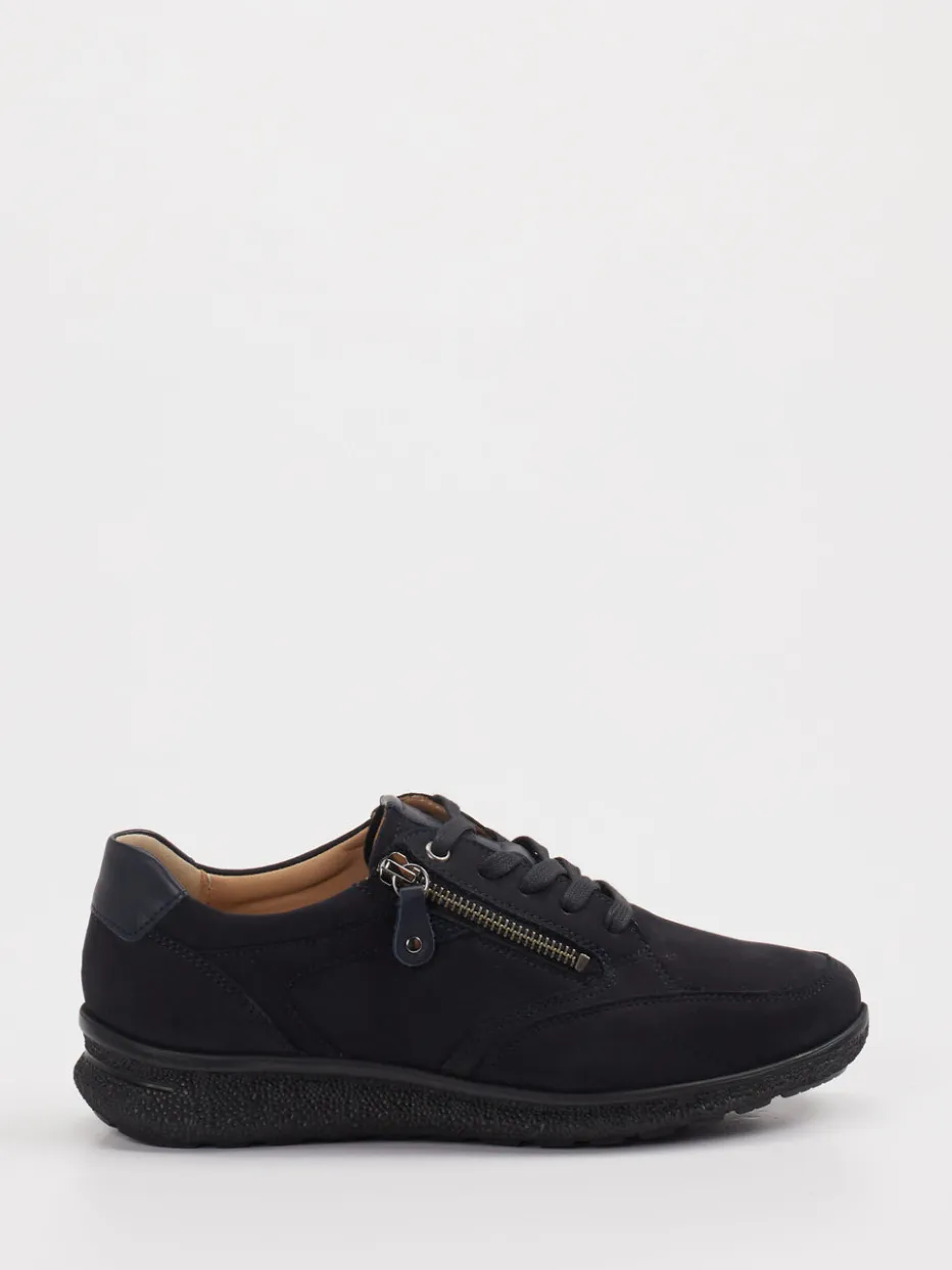 Komfort trifft dezente Eleganz.Hartjes präsentiert einen Damen-Komfort-Sneaker, der Alltagstauglichkeit und Zurückhaltung stilsicher kombiniert. Das Modell setzt auf eine glatte, matte Lederoberfläche in kräftigem Dunkelblau, wobei die Kombination aus Nubukoptik und glattem Leder an der Fersenkappe eine subtile Struktur schafft. Ton-in-Ton-Nähte und ein seitlicher Metallreißverschluss ergänzen die klassische Silhouette. Die gepolsterte Gummisohle sorgt für angenehme Dämpfung und ein ruhiges Laufgefühl, unterstützt durch die Einlagenfreundlichkeit. Inspiriert vom Minimalismus fügt sich der Schuh perfekt in den „Quiet Luxury“-Trend ein und lässt sich gut zu legeren Outfits kombinieren. Ein zuverlässiger Alltagsbegleiter mit klarer Designhandschrift von Hartjes.