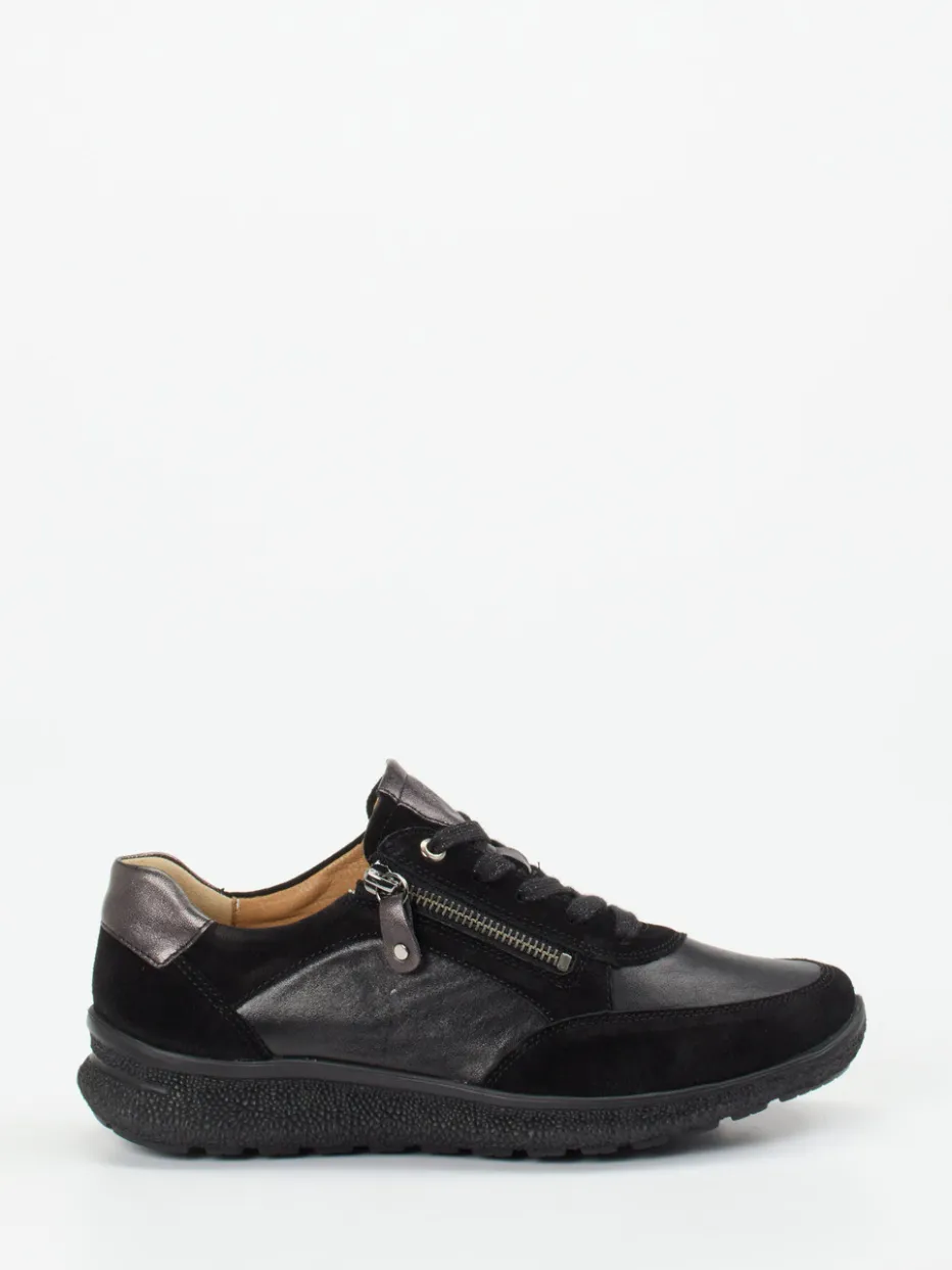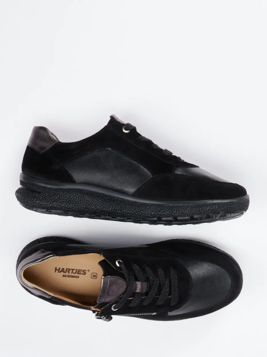 Dezente Akzente, hoher Tragekomfort.Hartjes präsentiert einen eleganten Komfort-Sneaker für Damen. Ideal für den Alltag überzeugt das Modell durch seine komfortorientierte Bauweise: Gefertigt aus hochwertigem Velours- und Glattleder zeigt es eine matte Oberfläche in klassischem Schwarz mit Details in Anthrazit und Metallicgrau. Der seitliche Reißverschluss ergänzt die Schnürung funktional und unterstreicht den modernen Look, während gepolsterte Partien für dauerhafte Bequemlichkeit sorgen. Die griffige Gummisohle unterstützt leichtes Gehen, inspiriert von Comfort-Core- und Quiet-Luxury-Trends. Ein anpassungsfähiger Schuh für minimalistisch geprägte Looks. Ein durchdachtes Design-Erlebnis mit Hartjes-Komfortversprechen.