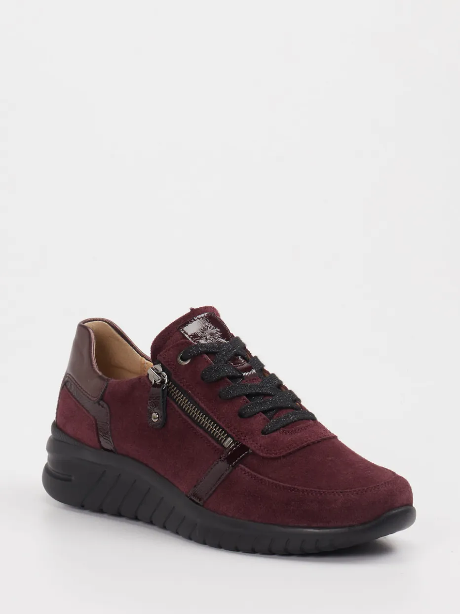 Viel Komfort im Alltag. Hartjes präsentiert einen modernen Komfort-Sneaker für Damen, gefertigt aus hochwertigem Veloursleder. Das bordeauxrote Modell überzeugt mit geschmackvoll mattem Finish und glänzenden Lackdetails an Ferse und Seiten. Die klassisch-sportliche Silhouette verläuft leicht keilförmig und sorgt gemeinsam mit der weich gepolsterten Laufsohle für hohen Tragekomfort. Dank seitlichem Reißverschluss und Schnürung lässt sich der Schuh komfortabel an- und ausziehen. Inspiriert vom „Functional Comfort“-Trend bietet er entspannte Eleganz für Casual-Looks. Verlässliche Passform und sanfte Ergonomie machen ihn zum stilvollen Begleiter in der Freizeit – mit der typischen Hartjes-Leichtigkeit.