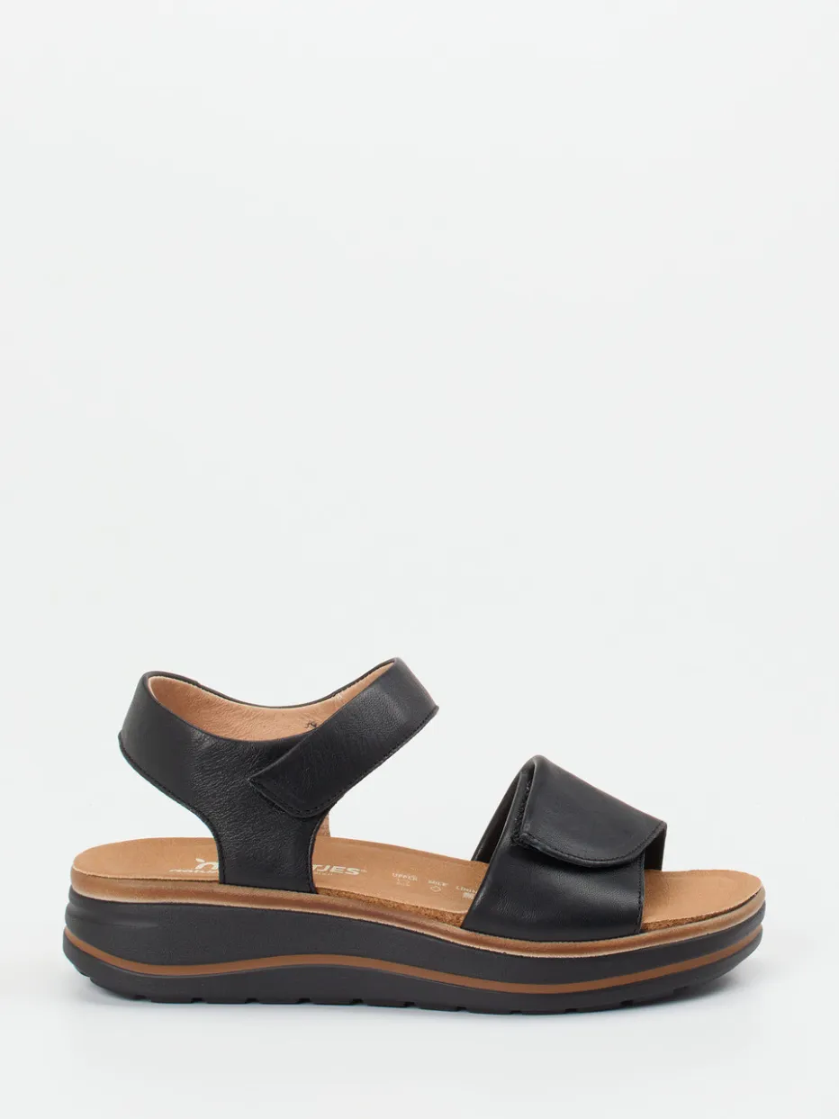 Optimal für entspannte Tage im Alltag oder auf Reisen bietet dieses Modell dank ergonomisch gepolstertem Fußbett und verbreiterter Weite H maximalen Komfort. Schwarzes, mattes Kalbleder formt gemeinsam mit breiten Klettverschlüssen eine anpassbare Passform. Innen sorgt weiches Lederfutter für angenehme Haptik, während die zweifarbige Zwischensohle in Kombination mit der Gummisohle samt Abroll-Linie den modernen Look unterstreicht. Ton-in-Ton-Nähte und eine offene, ergonomische Silhouette greifen minimalistische Designimpulse auf – perfekt zu Leinenhose und Sommerbluse.