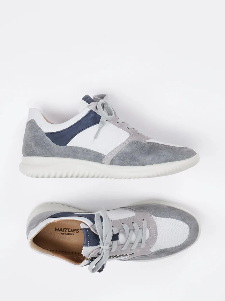 Komfort trifft sportliche Eleganz.Die Marke Hartjes präsentiert mit diesem Sneaker ein leichtes Damenmodell für Alltag und Freizeit. Ideal für entspannte Tage, vereint der Sneaker hochwertigen Tragekomfort mit modischer Zurückhaltung. Veloursleder in Grau wird durch helles, perforiertes Leder und atmungsaktive Mesh-Anteile ergänzt. Dunkelblaue Farbdetails setzen sportlich-minimalistische Akzente. Die klassische Silhouette mit Schnürung und praktischem Reißverschluss unterstützt schnelles An- und Ausziehen. Durch die weiche Gummisohle mit rutschhemmendem Profil und das lederne Innenfutter eignet sich der Schuh optimal für ganztägige Bewegung. Dezenter Streetwear-Einfluss trifft auf Komfort-Purismus der Saison. Reißverschluss-Komfort und edle Verarbeitung – typisch Hartjes.