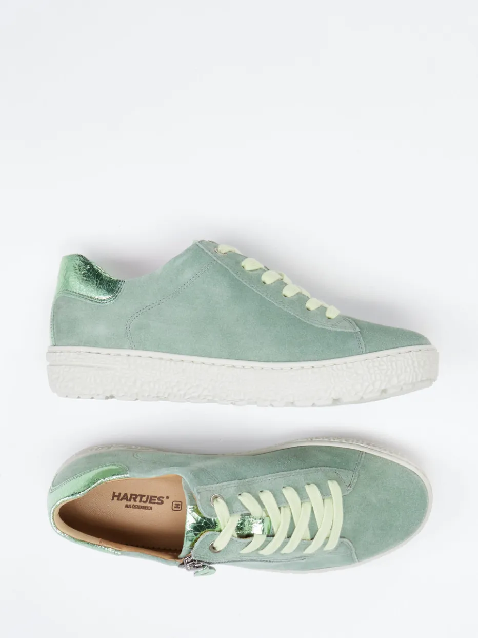 Pastellige Raffinesse trifft Komfort.Hartjes präsentiert mit diesem Sneaker ein Modell für entspannte Looks und anspruchsvolle Füße. Ideal für Alltag und Reisen punktet der Low-Top-Sneaker mit salbeigrünem Veloursleder, samtig angeschliffen, kombiniert mit glänzenden Metallic-Details an Ferse und Zunge. Farblich abgestimmte Schnürsenkel und ein seitlicher Reißverschluss ergänzen das Design funktional und stilvoll. Die Profilsohle aus extraleichtem Gummi und die herausnehmbare Innensohle sorgen für hohen Tragekomfort. Pastelltöne und Streetwear-Anklänge verleihen der Silhouette einen zeitgemäßen Look. Höchster Komfort in modischer Zurückhaltung – typisch Hartjes.
