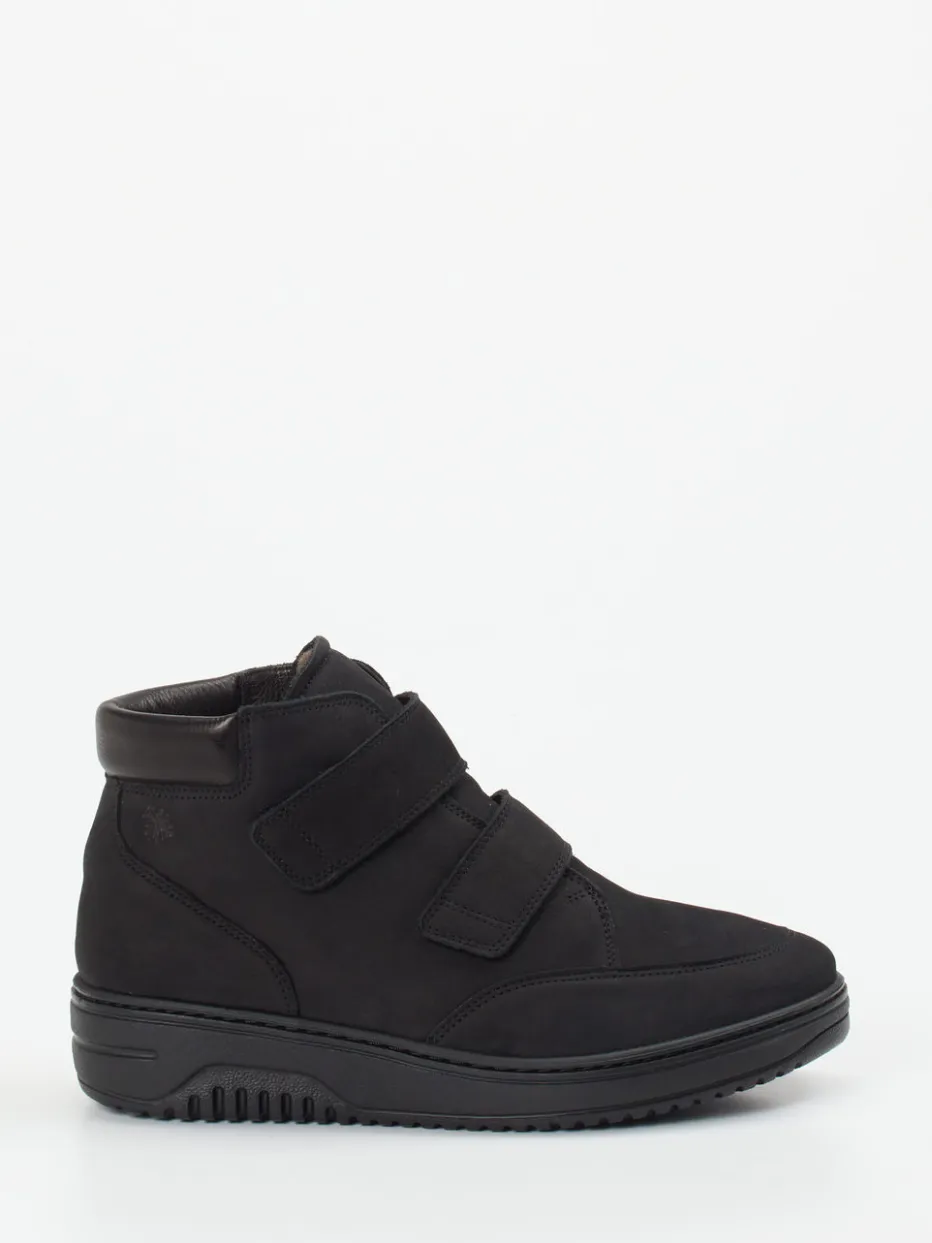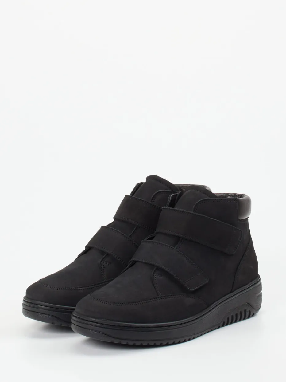 An kalten Tagen sorgt das kuschelige Lammfellfutter für wohltuende Wärme, während das schwarze Nubukleder mit samtiger Haptik in Verbindung mit Ton-in-Ton-Nähten und gepflegter Uni-Optik eine zurückhaltend elegante Wirkung erzielt. Zwei symmetrisch platzierte Klettverschlüsse bieten praktischen Einstiegskomfort, ergänzt durch einen weich gepolsterten Schaftrand aus Glattleder. Die knöchelhohe Form und das rutschhemmende Laufprofil unterstreichen die wintertaugliche Funktionalität. Kombinierbar zu Thermoleggings oder lässigen Winteroutfits.
