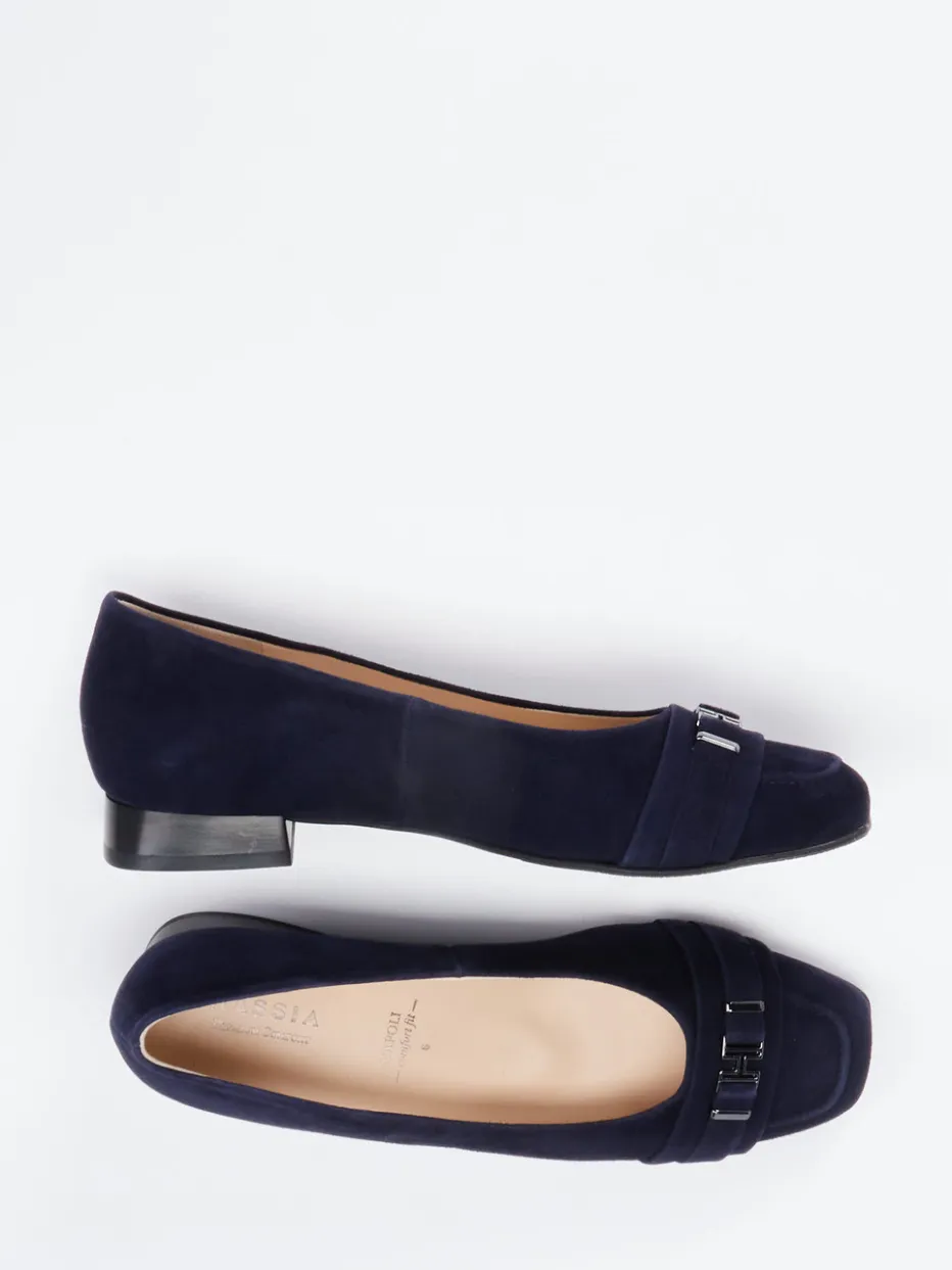 Stilsicher im minimalistischen Chic.Die Marke Hassia überzeugt in der Kategorie Ballerinas mit einem Modell, das klassischen Anspruch und modisches Feingefühl vereint. Ob im Büro oder bei urbanen Freizeitmomenten – der in dunkelblauem Veloursleder gearbeitete Schuh mit matter Oberfläche erfüllt stilvolle Erwartungen. Der bequeme, schwarze Blockabsatz ergänzt die flache Silhouette formvollendet. Eine silberfarbene Trensengarnitur ziert das Vorderblatt und verleiht dem Design einen markentypischen Akzent. Als Schlupfschuh ohne Verschluss konzipiert, eignet sich das Modell für Komfortliebende mit Anspruch an hochwertige Materialien und wechselbares lederbezogenes Fußbett. Ein eleganter Allrounder mit femininer Note und „Quiet Luxury“-Charakter.