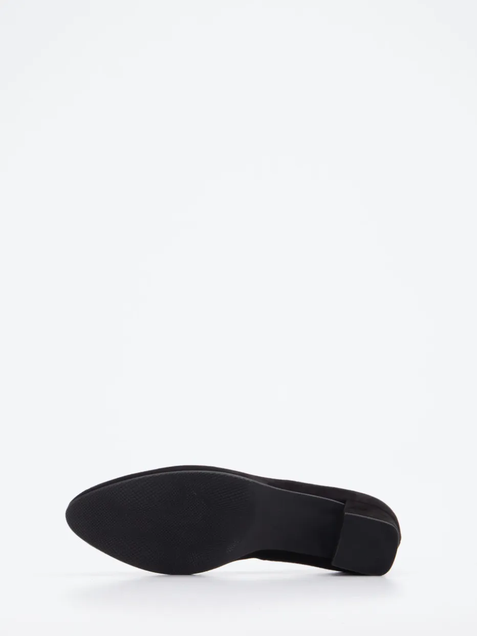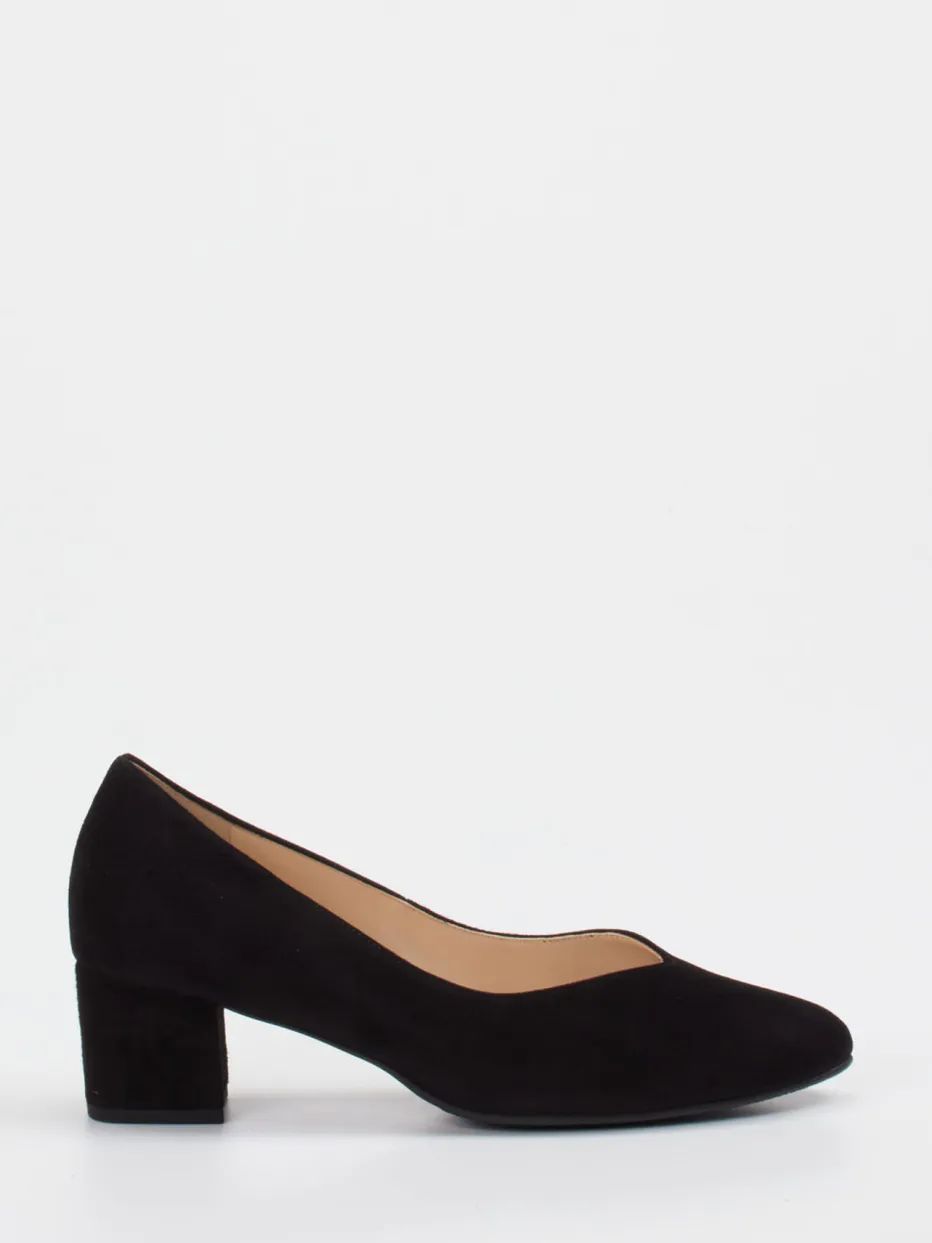 Zeitlose Eleganz und alltagstauglicher Komfort verbinden sich bei diesen Pumps aus schwarzem Veloursleder mit klassischer Silhouette und bequemem Blockabsatz.