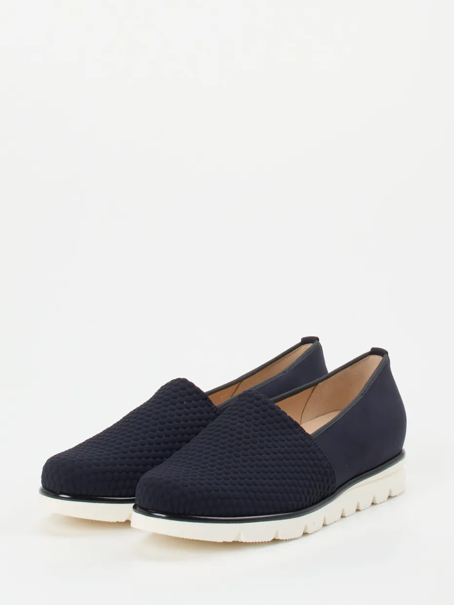 Moderner Komfort für entspannte Tage.Die Marke Hassia präsentiert mit diesem Komfort-Slipper ein Modell für Damen mit einem hohen Anspruch an Bequemlichkeit und Schlichtheit. Ideal für Freizeit und Alltag bietet der sportive Schlupfschuh mit dunkelblauem Textilmaterial, matter Wabenstruktur und flacher, rund zulaufender Form ein zurückhaltend stilvolles Erscheinungsbild. Der elastische Einstieg erleichtert das Anziehen, während die rutschhemmende, weiße Leichtzellsohle mit Glanzkante sicheren Tritt verspricht. Die atmungsaktive Lederfütterung und das herausnehmbare Fußbett sorgen zusätzlich für angenehmes Tragen – auch mit Einlagen. Perfekt kombinierbar mit Stretch-Jeans oder Steppjacke. Hassia steht für wohldurchdachten Komfort mit urbanem Anspruch.