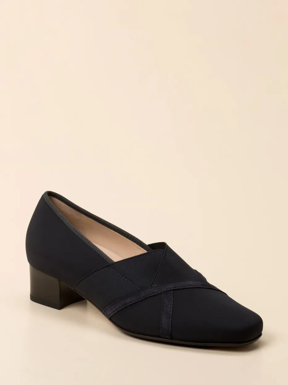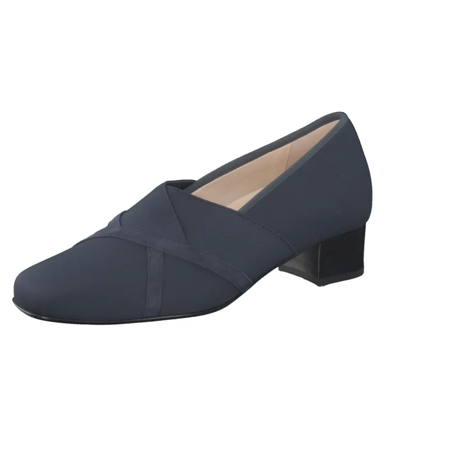 Komfort trifft zurückhaltende Raffinesse.Hassia präsentiert diesen hochwertigen Damen-Komfortpumps in elegantem Dunkelblau. Ideal für lange Bürotage oder den stilvollen Alltag bietet das Modell durch elastisches Neopren-Textil einen perfekten Sitz sowie überkreuzte breite Elastbänder für sicheren Halt. Die samtig-matten Veloursleder-Streifen setzen dezente Akzente, während die orthopädisch geformte Lederdecksohle ein bequemes Tragegefühl garantiert – auch mit Einlagen. Die klassisch geschlossene Silhouette mit eckiger Vorderpartie und 3 cm hohem Blockabsatz wirkt zeitlos und vielseitig kombinierbar. Besonders harmonisch wirkt das Modell zu Stoffhosen oder maritimen Blazern. Hassia überzeugt mit langlebigem Komfort und formschöner Alltagstauglichkeit.