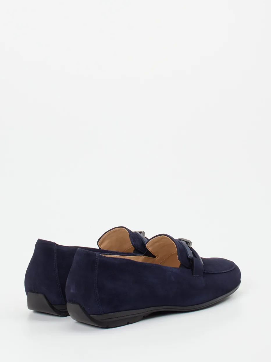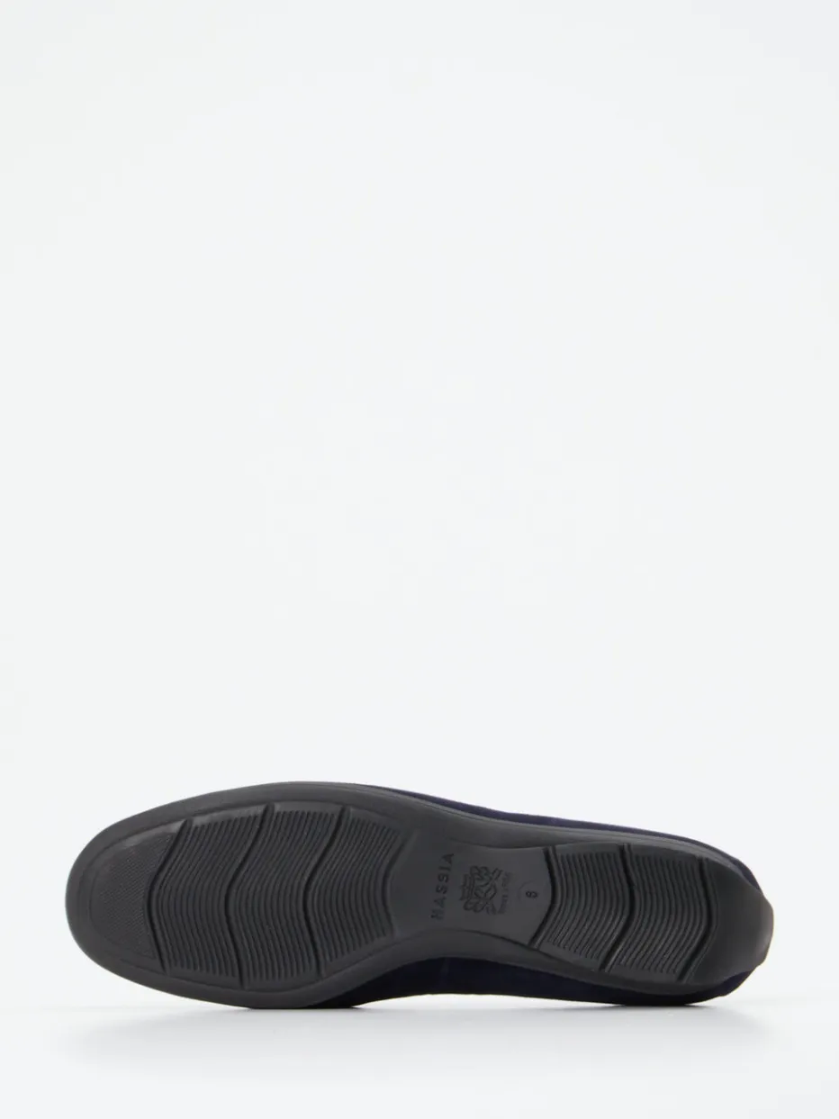 Ideal für Arbeitsalltag und Freizeit besticht das Modell durch marineblaues Veloursleder, samtig angeschliffen und mit matter Oberfläche. Die klassische, flache Silhouette wird akzentuiert von einer Ton-in-Ton gestalteten Zierspange mit dunkler Metallmitte. Eine profilierte Gummisohle bietet sicheren Tritt, das gepolsterte Wechselfußbett in Weite G sorgt für angenehmen Laufkomfort – auch für Einlagen geeignet. Das Design folgt dem Trend „Quiet Luxury“ und eignet sich für vielseitige Ton-in-Ton Stylings.