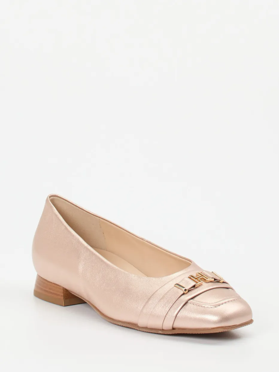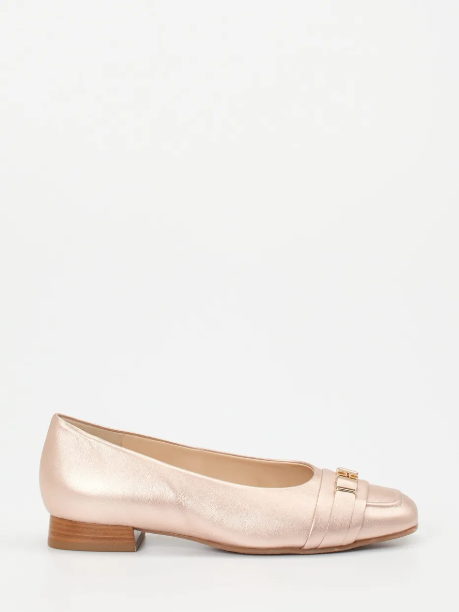 Ob im Büro oder bei gepflegten Freizeitlooks – der bequeme Blockabsatz und das wechselbare, lederbezogene Fußbett bieten ganztägigen Komfort. Das pudrige Metallicleder mit irisierendem Finish wird durch eine goldfarbene Trensenspange auf dem Carréleisten betont. Die klassische Silhouette in Schlupfform überzeugt mit schlichter Eleganz, während die roségoldene Farbgebung dezent dem „Quiet Luxury“-Trend folgt. Ideal kombinierbar mit hellen Business-Kleidern oder monochromen Ensembles.