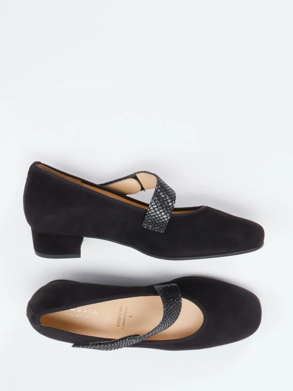 Das matte Veloursleder sorgt für eine angenehm weiche Haptik und überzeugt in elegantem Schwarz. Ein auffälliger Riemen aus Metallicleder mit Schimmer-Effekt in Schlangen-Prägung akzentuiert den Look und bietet dank Klettverschluss optimalen Halt. Der dezente Blockabsatz sowie die luftgepolsterte Gummisohle bieten ein angenehmes Gehgefühl – auch bei längeren Tagen im Büro oder beim Stadtbummel. Modisch inspiriert von 90er-Vintage und Quiet Luxury, lässt sich das Paar ideal mit dunklen Strumpfhosen und einer Veloursledertasche kombinieren.