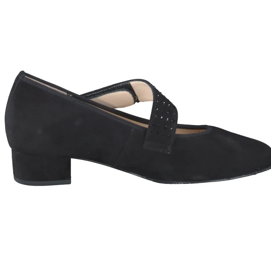 Ideal für lange Bürotage oder stilbewusste City-Termine: Das Modell in schwarzem, samtig angeschliffenem Veloursleder bietet dank ergonomischem Schnitt und Weite K spürbaren Laufkomfort. Der asymmetrisch positionierte Klettverschlussriemen mit dunklen Swarovski-Steinen sorgt für einen dezenten Glanzakzent. Der 3 cm hohe Blockabsatz ist stabil und alltagstauglich. Schlicht gerundete Linien unterstreichen die feminine Retro-Anmutung – passend zur „Quiet Luxury“-Ästhetik. Für zusätzlichen Nutzen bietet das herausnehmbare Fußbett Platz für orthopädische Einlagen.