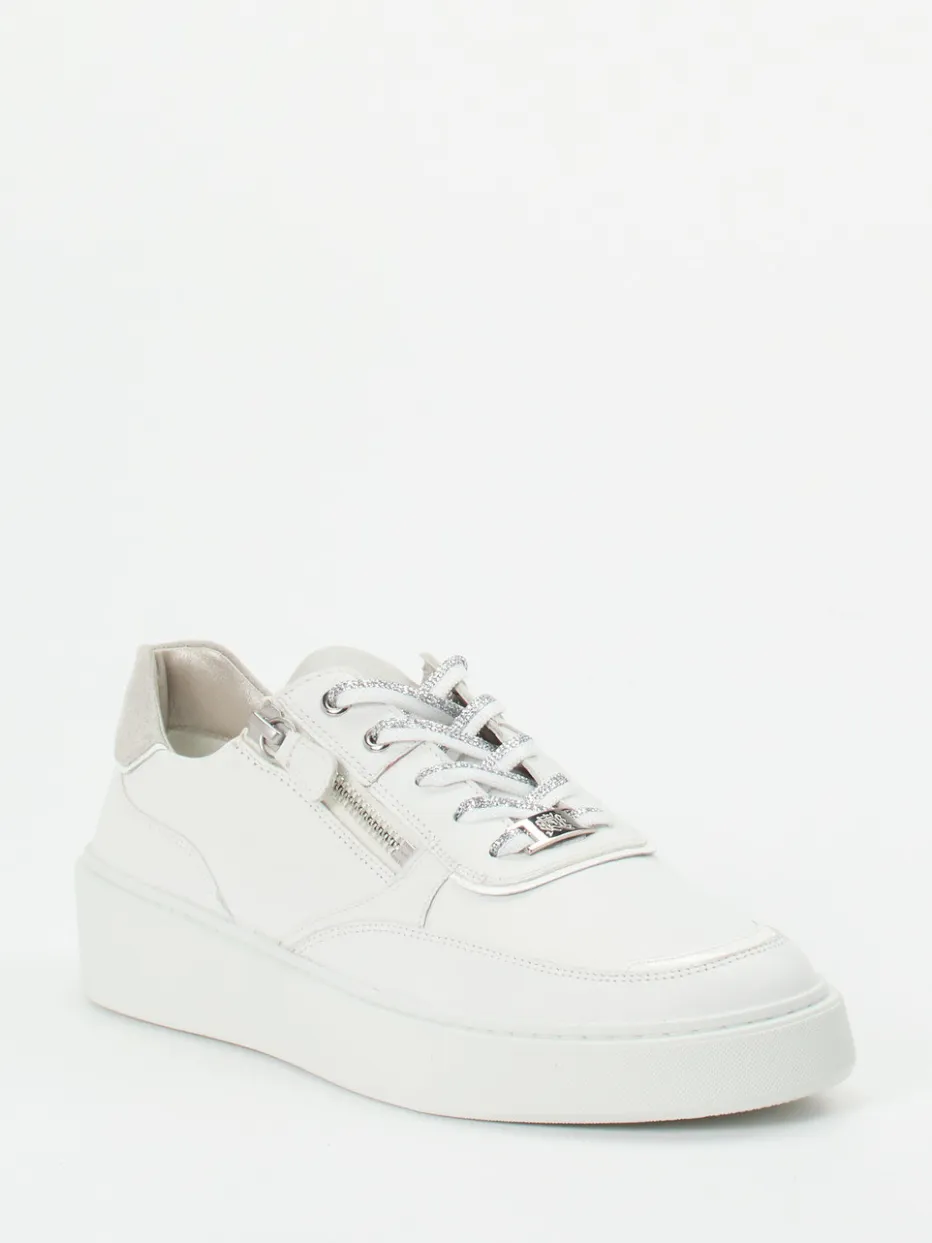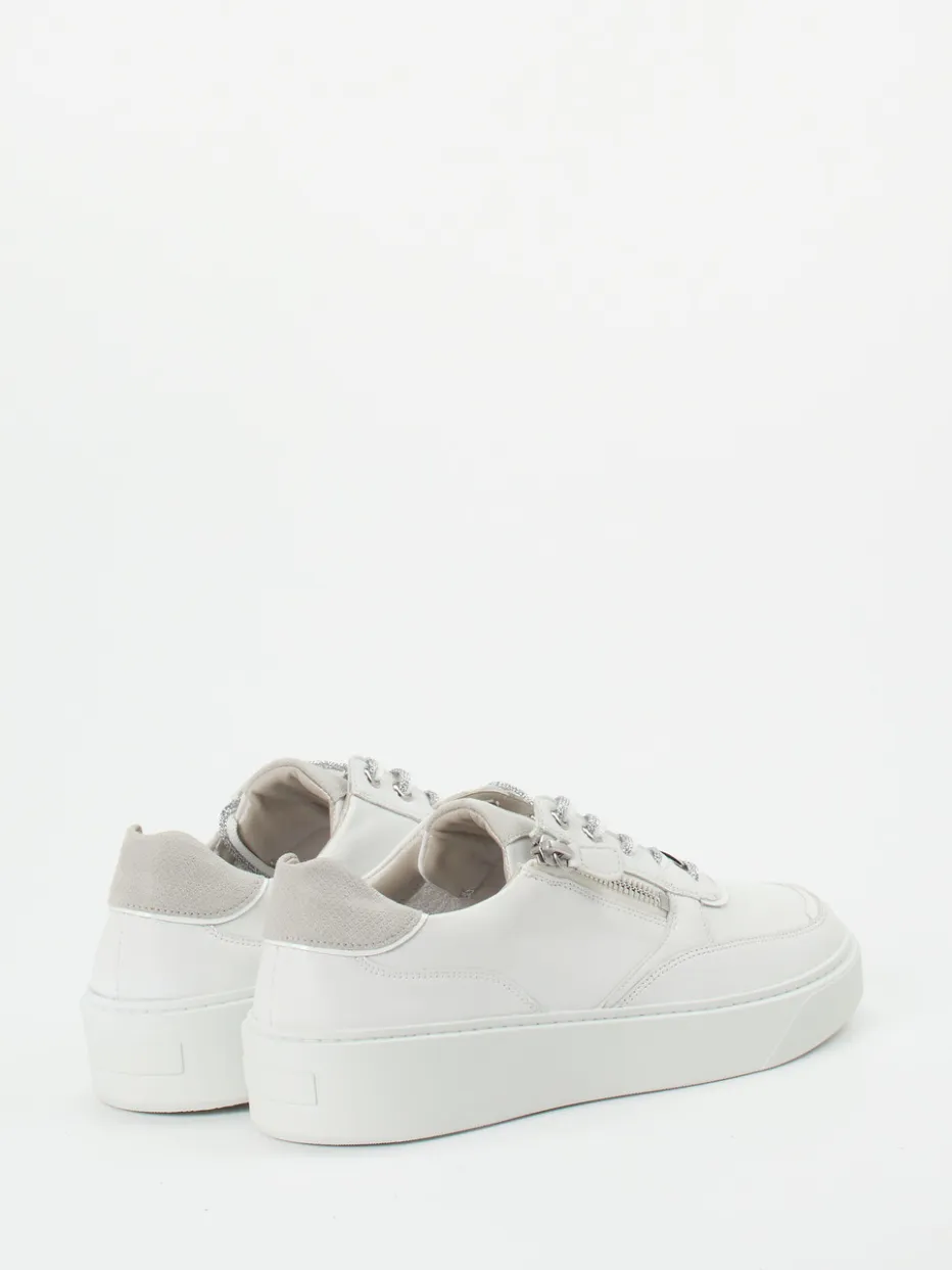 Aus hochwertigem, blütenweißem Kalbleder gefertigt, überzeugt das Modell durch eine matte Oberfläche und silberfarbene Details an Schnürung und Zipper. Der gepolsterte Fersenbereich und das austauschbare Fußbett sorgen für beständigen Tragekomfort. Die voluminöse Plateausohle mit rutschhemmendem Profil unterstreicht den modernen Streetwear-Charakter. Ideal zu Steppjacke und Crossbody-Bag in Pastelltönen.