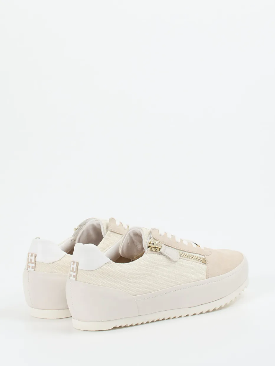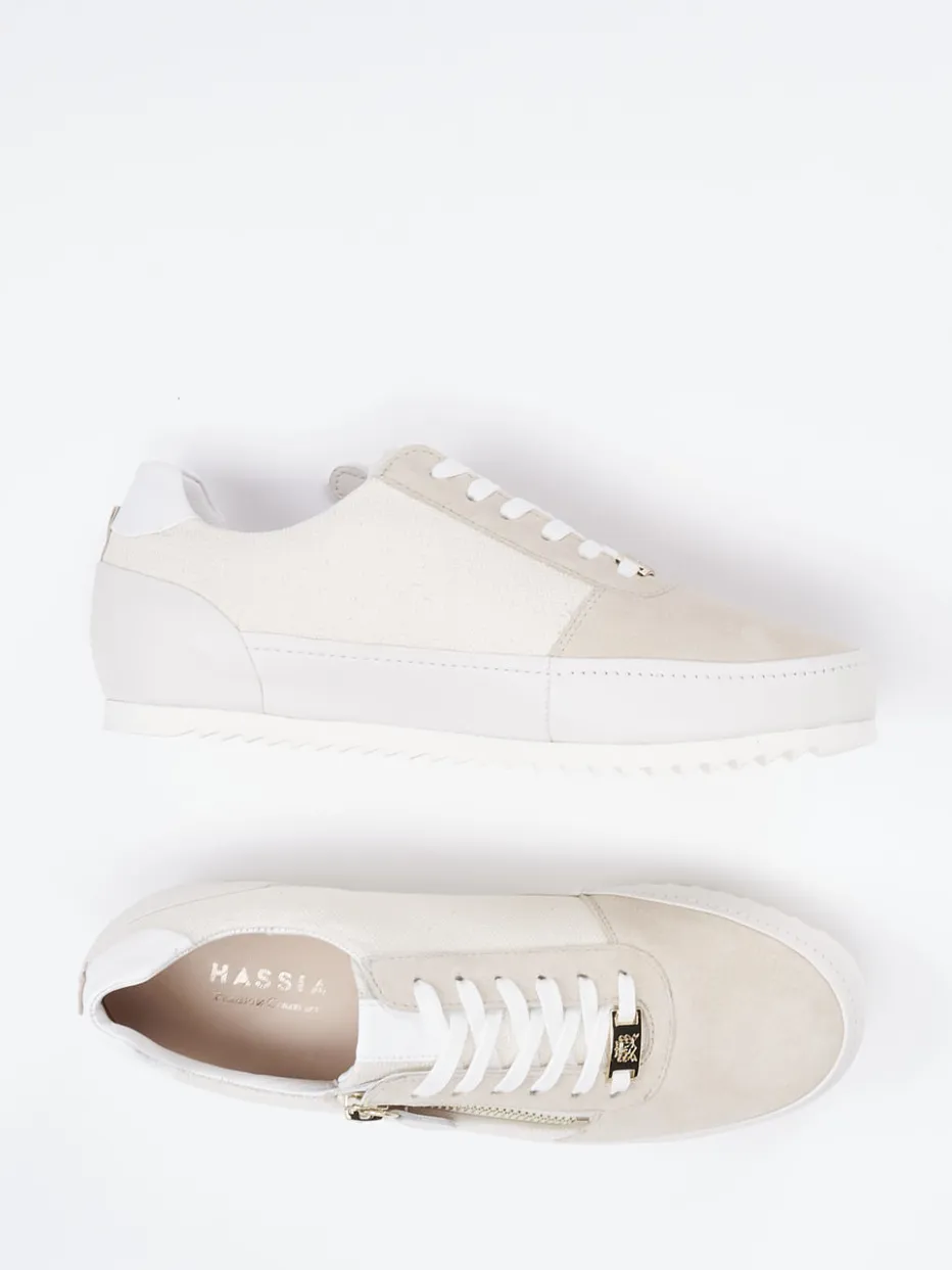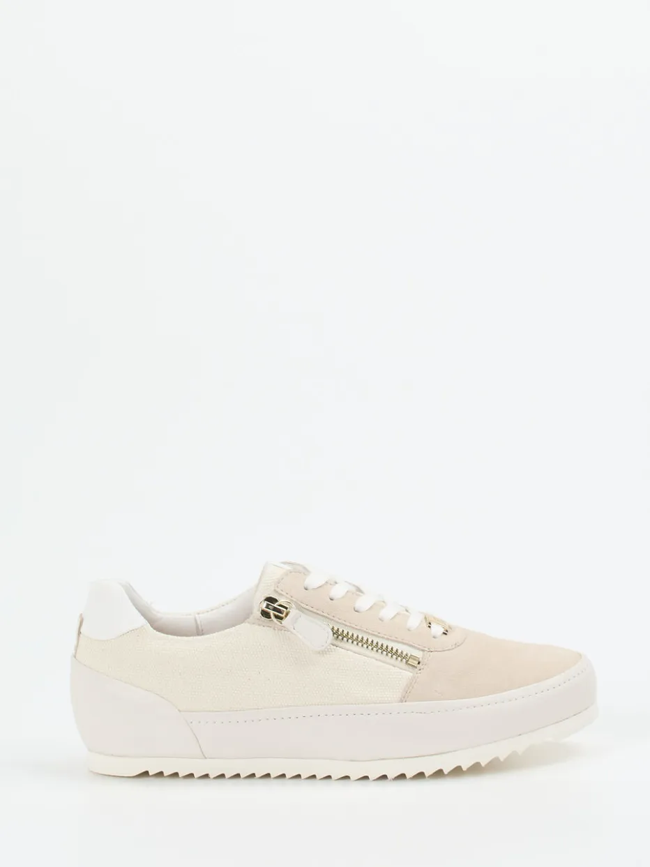 Puristischer Komfort für jeden Tag.Hassia präsentiert mit diesem Damen-Schnürschuh ein Modell für entspannte Alltagsmomente. Beigefarbenes Veloursleder trifft auf strapazierfähigen Canvas mit samtiger Haptik und dezenter Texturvariation. Der cleane Low-Top-Schnitt wird durch weiße Akzente und goldfarbene Details subtil aufgewertet. Ein seitlicher Reißverschluss erleichtert das Anziehen, während die gepolsterte Ausstattung und das bequeme Wechselfußbett zusätzlichen Komfort bieten. Die rutschhemmende Gummisohle mit Zackenprofil sorgt für Alltagstauglichkeit – perfekt abgestimmt auf den Trend „Quiet Luxury“. Stilistisch passt das Modell zu Leinenhose und Canvas-Tasche. Komfortbetont, stilvoll und unkompliziert – ein echtes Everyday Essential von Hassia.