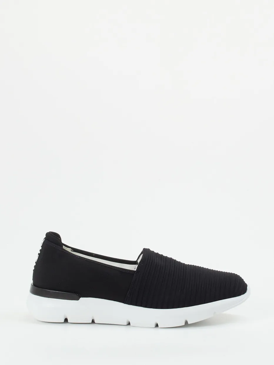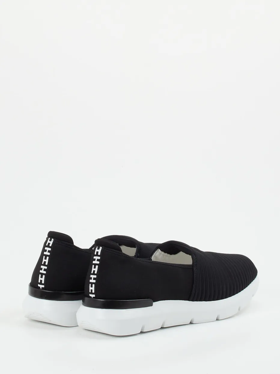 Schlichte Dynamik neu interpretiert.Hassia bietet mit diesem Slipper ein hochkomfortables Modell für sportiv-legere Alltagslooks. Ideal für alle, die Wert auf Leichtigkeit und Passform legen: Das gerippte Stretch-Textil sorgt für ein flexibles Tragegefühl in weiter H-Form, während das Innenfutter aus Leder und das Vario-Wechselfußbett durchdachten Komfort bieten. Markante weiße Gummisohle mit Profil, elastischer Einstieg und Logo-Detail an der Ferse prägen das minimalistische Streetwear-Design im schwarzen Ton-in-Ton-Look. Ein Schuh ganz im Zeichen von Quiet Luxury und moderner Alltagstauglichkeit mit athletischem Touch. Hassia definiert Bequemschuhe mit Premium-Komfort und urbanem Stilverständnis.