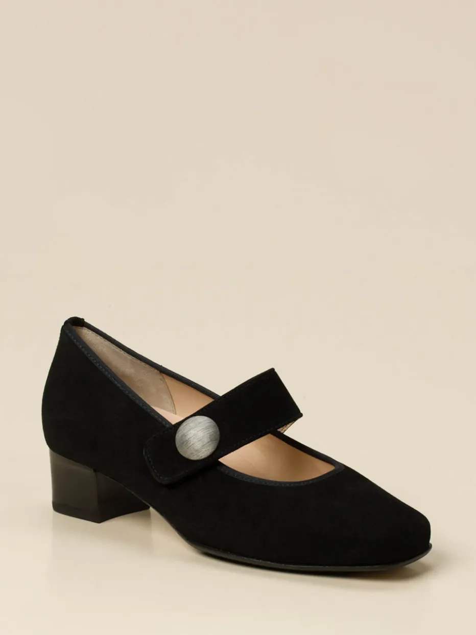 Dieser Pump kombiniert hochwertiges Nubukleder mit eleganter Retro-Anmutung und überzeugt durch bequemen Einstieg sowie zurückhaltende Zierschnalle.