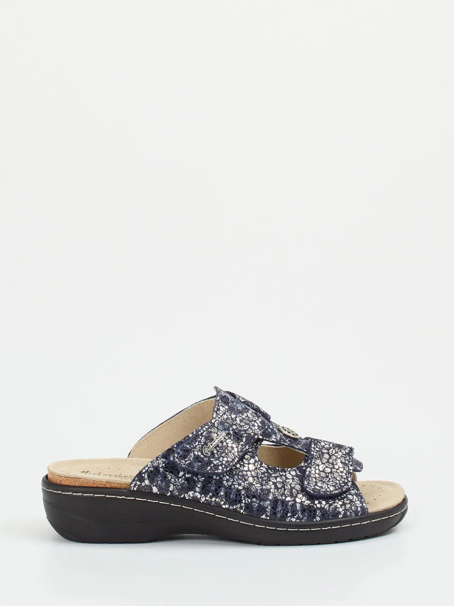 Für stilvolle Bequemlichkeit im Alltag.Die Marke Hickersberger präsentiert eine Komfort-Pantolette mit anatomisch geformtem Kräuterfußbett. Die offene, ergonomisch geformte Silhouette in Dunkelblau kombiniert geprägtes Leder mit einem floralen Metallic-Print und glänzender Oberfläche. Zwei verstellbare Klettverschlüsse sorgen für perfekten Sitz, während ein silberfarbener Metallknopf das Design akzentuiert. Die gepolsterte Innensohle trägt zum hohen Laufkomfort bei. Eine dunkel abgesetzte PU-Keilsohle mit Kontrastnähten ergänzt den femininen Look. Optimal für Freizeit, Zuhause oder entspannte Momente – besonders für modebewusste Trägerinnen mit Komfortanspruch. Authentische Wohlfühlästhetik mit funktionalem Anspruch – Hickersberger-typisch.