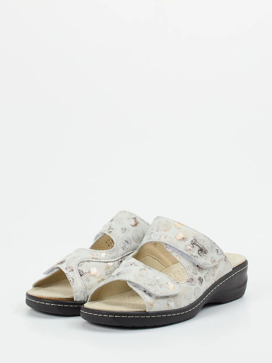 Gesundes Gehen in stilvollem Look.Die Marke Hickersberger präsentiert eine besonders komfortable Damen-Pantolette für Alltag und entspanntes Zuhause. Für alle, die sommerliche Leichtigkeit mit orthopädischem Nutzen verbinden möchten, bietet dieses Paar einen durchdachten Aufbau. Geprägtes Leder in hellem Beige trifft auf dezente Metallic-Akzente im Punktdesign – angenehm matt strukturiert und zugleich stilvoll. Zwei Klettverschlüsse ermöglichen individuelle Anpassung bei verstellbarer G-Weite. Die ergonomische Form mit gepolsterter Innensohle, Kräuterfußbett und PU-Sohle mit Schockabsorber sorgt für spürbare Entlastung beim Gehen. Ein Wohlfühlmodell, das Healthcore-Ästhetik mit Soft-Metallic-Trend souverän verbindet. Hickersberger steht für funktionale Fußgesundheit mit Alltagscharakter.