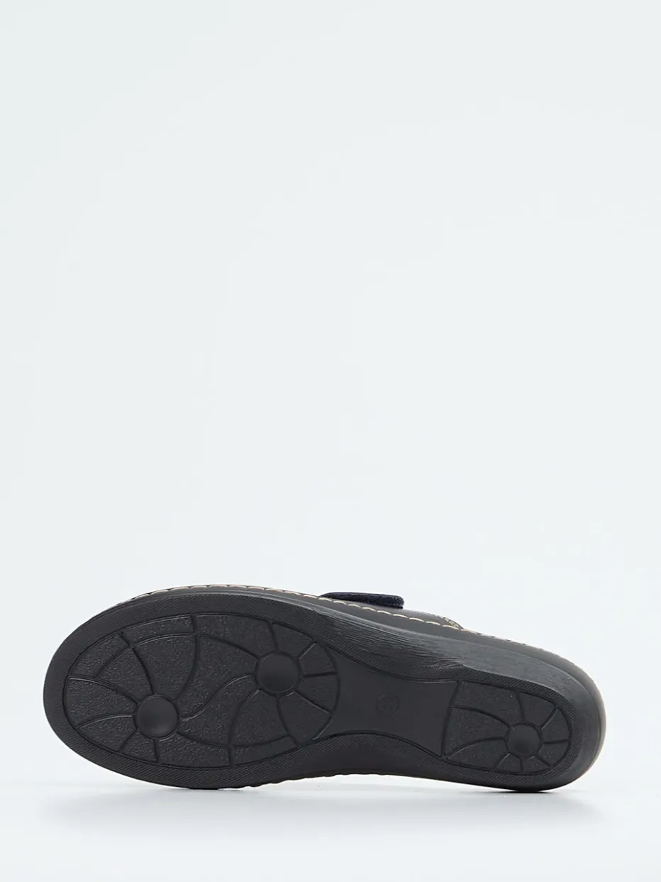 Gefertigt für entspannte Tage.Die Marke Hickersberger bringt mit dieser Damen-Pantolette aus schwarzem Kalbleder ein Modell auf den Markt, das Komfort und Schlichtheit vereint. In Alltag und Freizeit punktet das ergonomisch geformte Naturkork-Fußbett mit weich perforierter Lederbezugsfläche und einem atmungsaktiven Wechselfußbett. Zwei Klettverschlüsse mit silberfarbenem Logoaccessoire sorgen für passgenauen Sitz. Die leicht erhöhte PU-Sohle ist rutschhemmend profiliert und mit handwerklichen Kontrastnähten versehen. Die matte Oberfläche, die dezente Farbgebung und die Formgebung unterstreichen den funktionalen Charakter. Optimal für eine bequeme Passform mit markentypischem Gesundheitsbewusstsein.