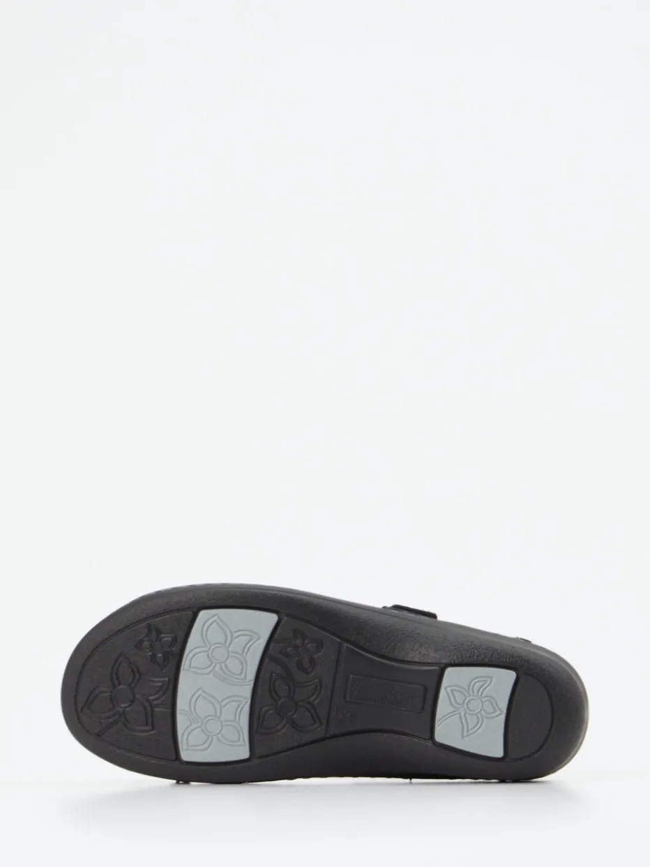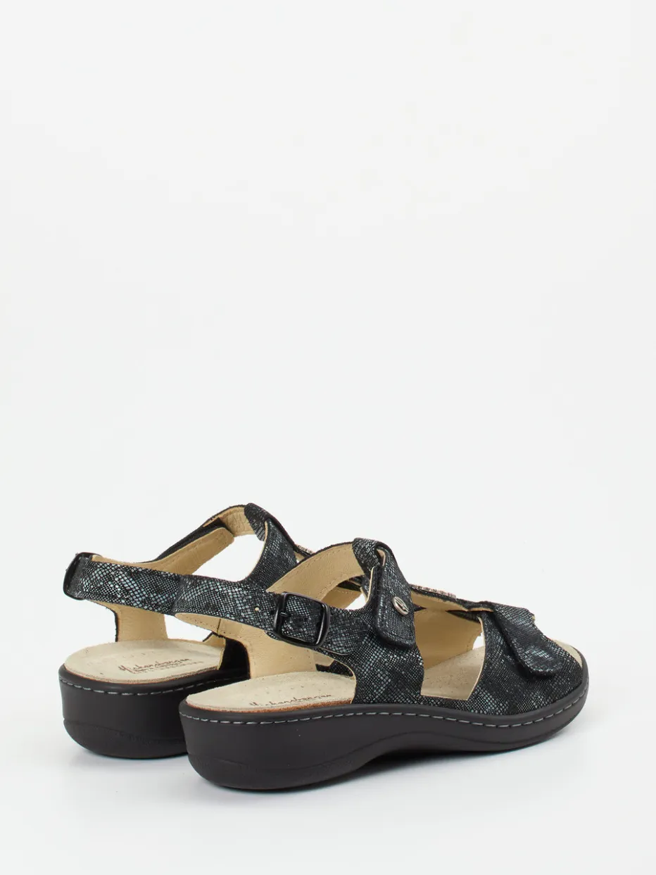 Ideal für entspannte Sommertage.Die Marke Hickersberger präsentiert mit dieser Komfortsandale ein Modell für Alltag und Freizeit. Das geprägte Leder mit Reptilstruktur zeigt sich in tiefem Schwarz mit dezentem Schimmer. Zierknöpfe in Metalloptik und eine strukturierte Oberfläche sorgen für dezente Eleganz. Die verstellbaren Klettverschlüsse und der Fersenriemen mit Schließe bieten individuellen Halt. Innen überzeugt ein anatomisch geformtes Fußbett mit Kräutereinlage und weichem Lederbezug. Die rutschhemmende PU-Sohle mit Blumenmuster rundet die funktionale Ausstattung ab. Mehr Komfort durch Markenhandwerk mit orthopädischem Anspruch.