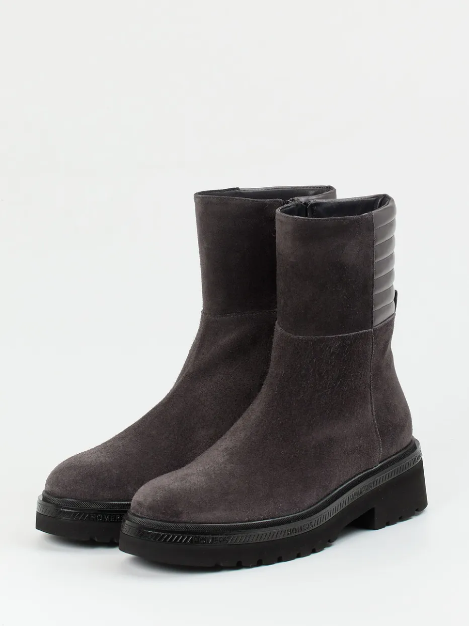 Modernes Understatement für Herbstlooks.Diese Ankle Boots von Homers vereinen minimalistisches Design mit komfortabler Funktion. Ideal bei wechselhaftem Wetter in der City oder im Büroalltag: Das matte Veloursleder in tiefem Anthrazit wird durch tonige Glattleder-Akzente am Schaft elegant ergänzt. Die gerade, mittelhohe Form erhält durch eine robuste Leichtzellsohle mit starkem Profil und 4 cm hohem Absatz markante Streetwear-Akzente. Ein seitlicher Reißverschluss sorgt für einfaches An- und Ausziehen, während gesteppte Partien an der Ferse das Tragegefühl unterstützen. Stilistisch passt das Modell zu Oversize-Coats oder Strickkleidern. Puristische Formsprache mit tragbarem Luxus – Homers interpretiert Chunky Boots neu.