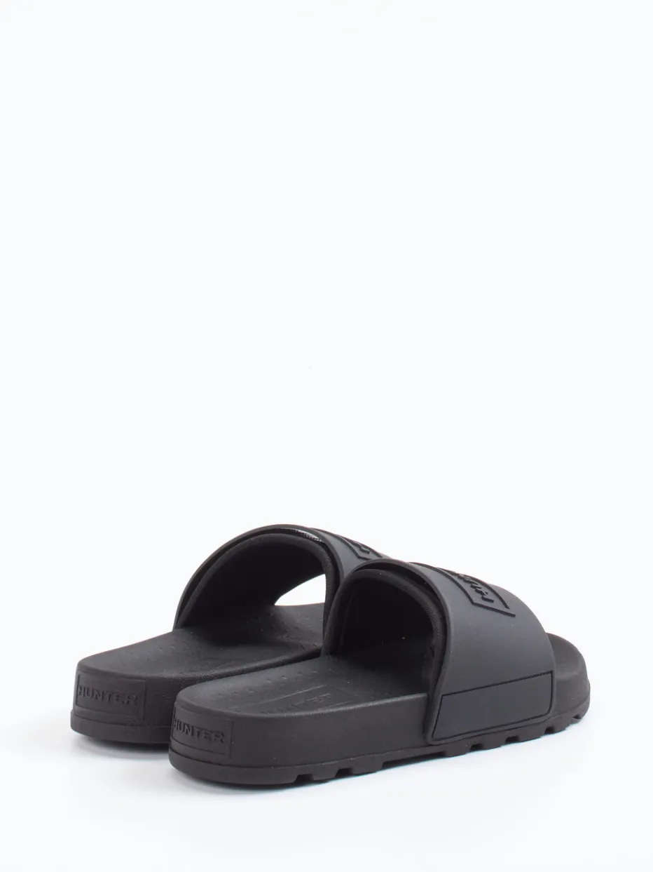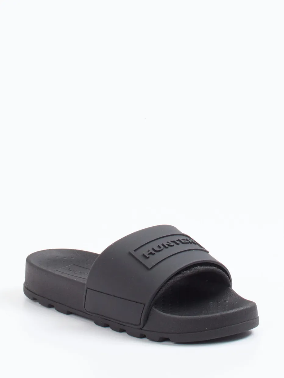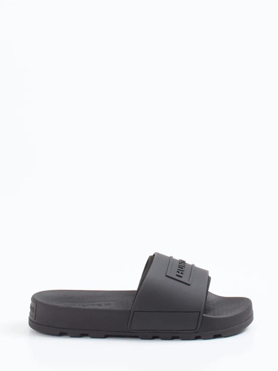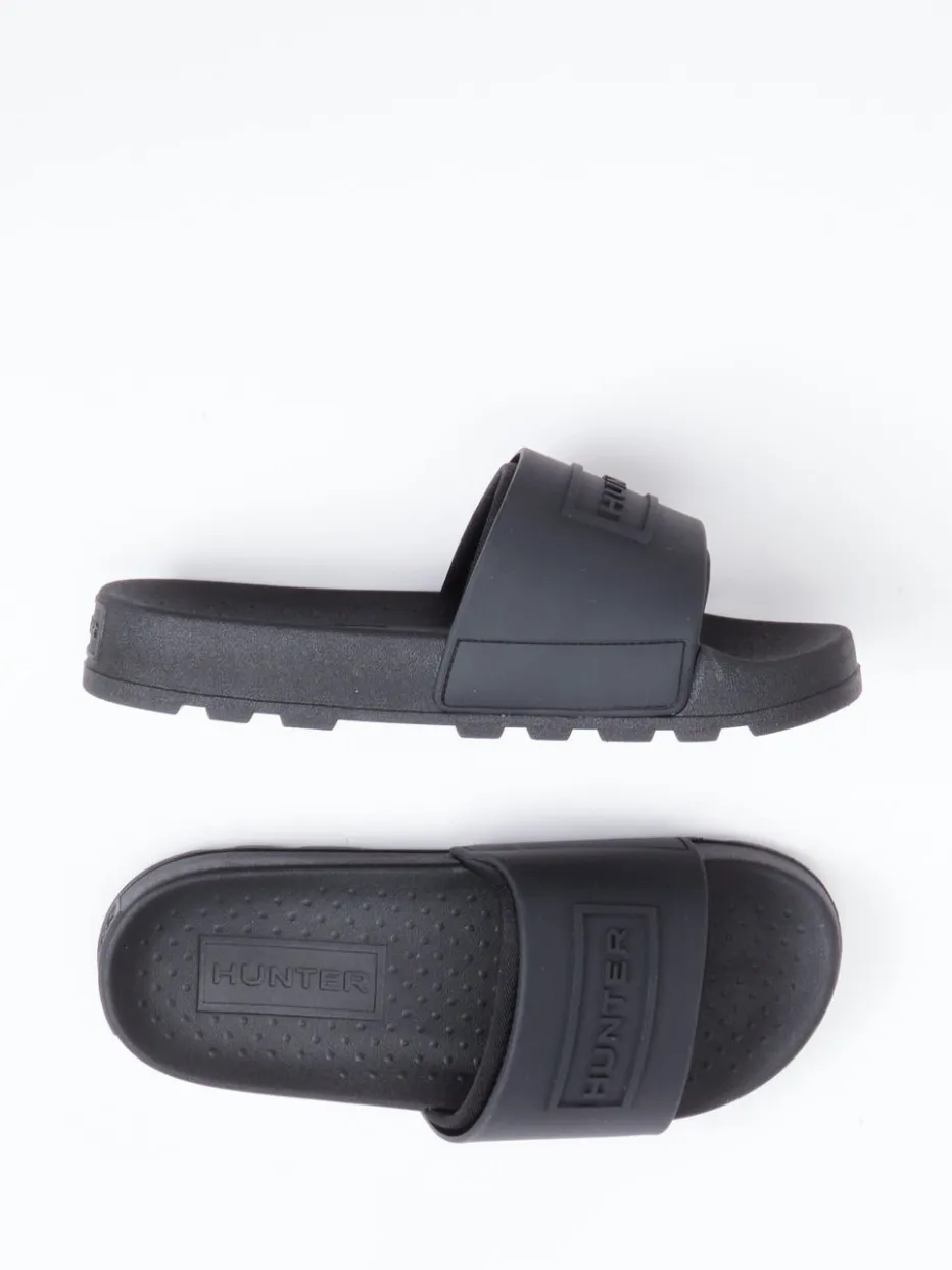 Strand-ready mit urbanem Spirit.Hunter interpretiert die klassische Badepantolette neu. Die tiefschwarze Unisex-Slide vereint matt strukturiertes Synthetikmaterial mit einem großzügig geformten Fußbett und einer robusten Gummisohle. Der breite Riemen mit Markenprägung akzentuiert das minimalistische Design, während die profilierte Laufsohle optimalen Halt auf nassem Untergrund bietet. Ideal für Sommertage, Urlaub oder entspannte Stunden zu Hause – inspiriert von Streetwear und „Quiet Luxury“-Trend. Lässt sich mühelos mit Badehose oder Lounge-Wear kombinieren. Hunter steht für funktionalen Komfort mit zeitlosem Stilanspruch.