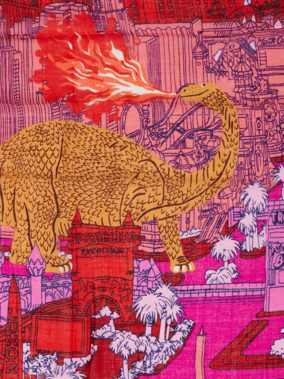 Ein expressives Accessoire mit künstlerischem Las-Vegas-Motiv, das durch leuchtende Farben und feine Wollqualität auffällt.