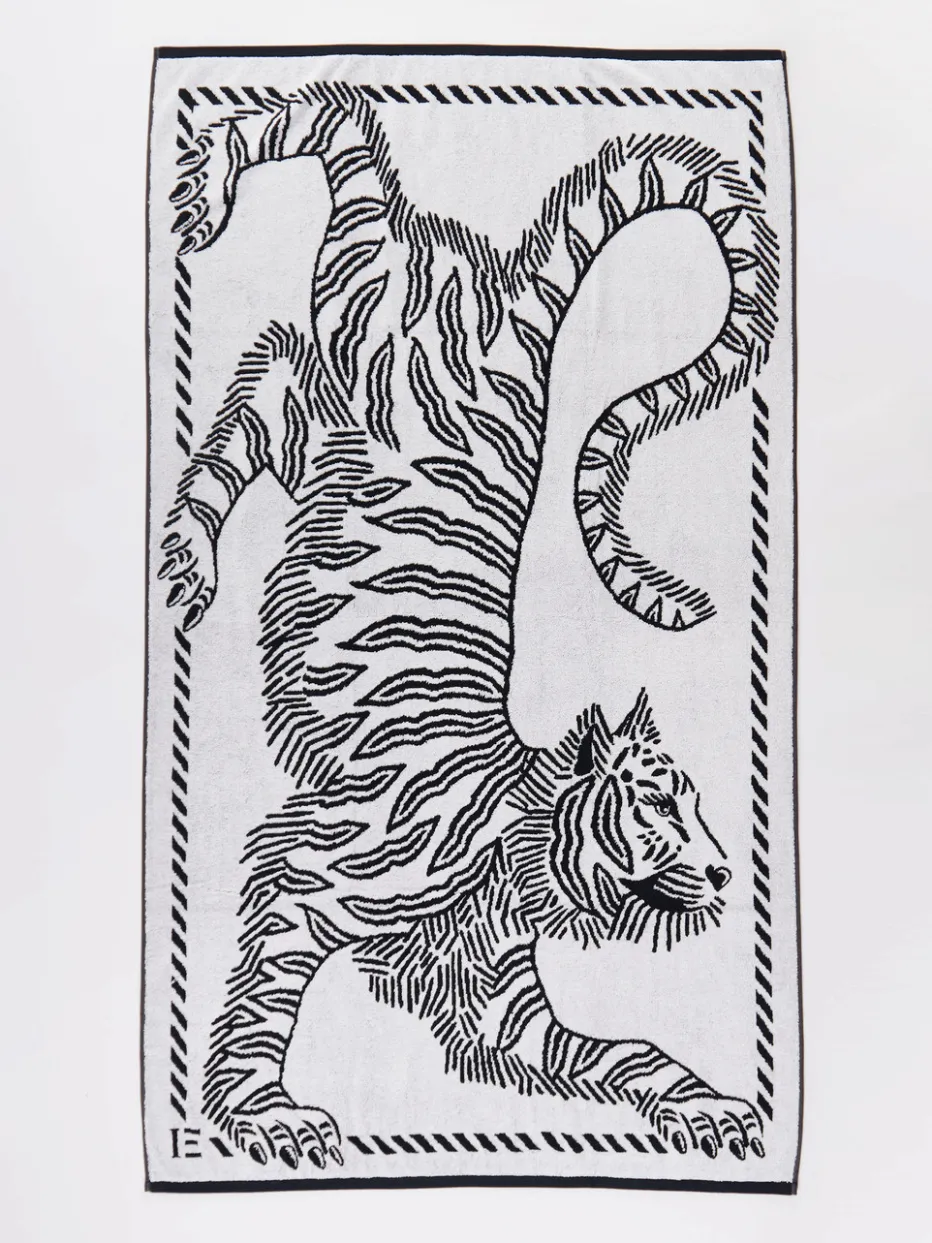 Weiches Baumwoll-Frottier trifft auf kunstvollen Tiger-Print – ein expressives Strandtuch mit starkem visuellen Eindruck für trendbewusste Sommertage.