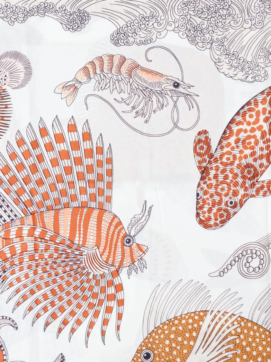 Illustrativer Print in maritimem Design trifft auf edle Materialkombination – ein Tuch, das Sommerflair und künstlerischen Anspruch vereint.