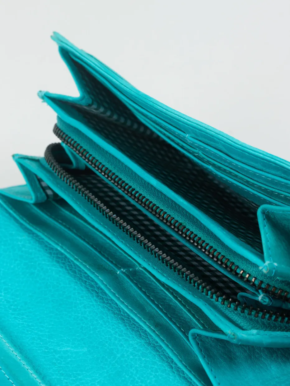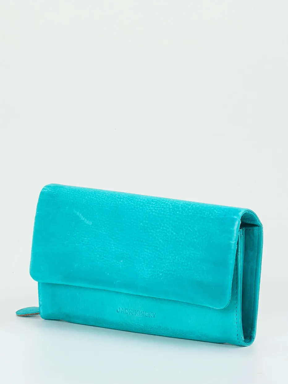 Die Marke Jack Kinsky präsentiert diese Geldbörse aus der Serie Nassau in einem tollen Farbton! Das hochwertige, türkisfarbene Kalbleder überzeugt durch die modische Struktur in angesagter Vintage-Optik und ist butterweich gearbeitet. Karten, Bargeld und Belege können dank der großzügigen Aufteilung sicher und praktisch verstaut werden. Für den Schutz Ihrer persönlichen Daten verfügt diese Geldbörse zusätzlich über einen zuverlässigen RFID-Blocker. Das eingravierte Markenemblem ziert unverkennbar. – Material: Kalbleder – Futter: Textil/Leder – Farbe: türkis – Größe: ca. 12 x 19 x 4 cm (H x B x T) – Innen: 18 Steckfächer, zwei Geldscheinfächer, zwei Belegfächer, ein zweigeteiltes Münzfach mit einem innenliegendem Fach sowie Reißverschluss – Verschluss: Überschlag mit Druckknopf