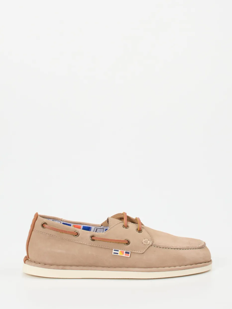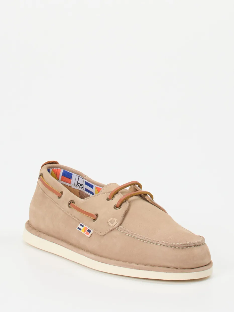 Der Bootsschuh von Joe kombiniert maritimes Design mit feinem Nubukleder in elegantem Beige. Für Freizeit und Urlaub ideal, setzt dieses Modell auf klassische Silhouette, weich angeschliffenes Nubuk und helle Steppnähte. Die umlaufende Lederschnürung und seitliche Metallösen sorgen für authentischen Bootsschuh-Charakter, während das bunte Logo an der Außenseite modische Akzente setzt. Eine flexible Gummisohle und ein weich gepolstertes Wechselfußbett bieten hohen Tragekomfort. Farblich harmoniert das Design mit „Soft Neutrals“ und passt zu Chino oder Poloshirt.