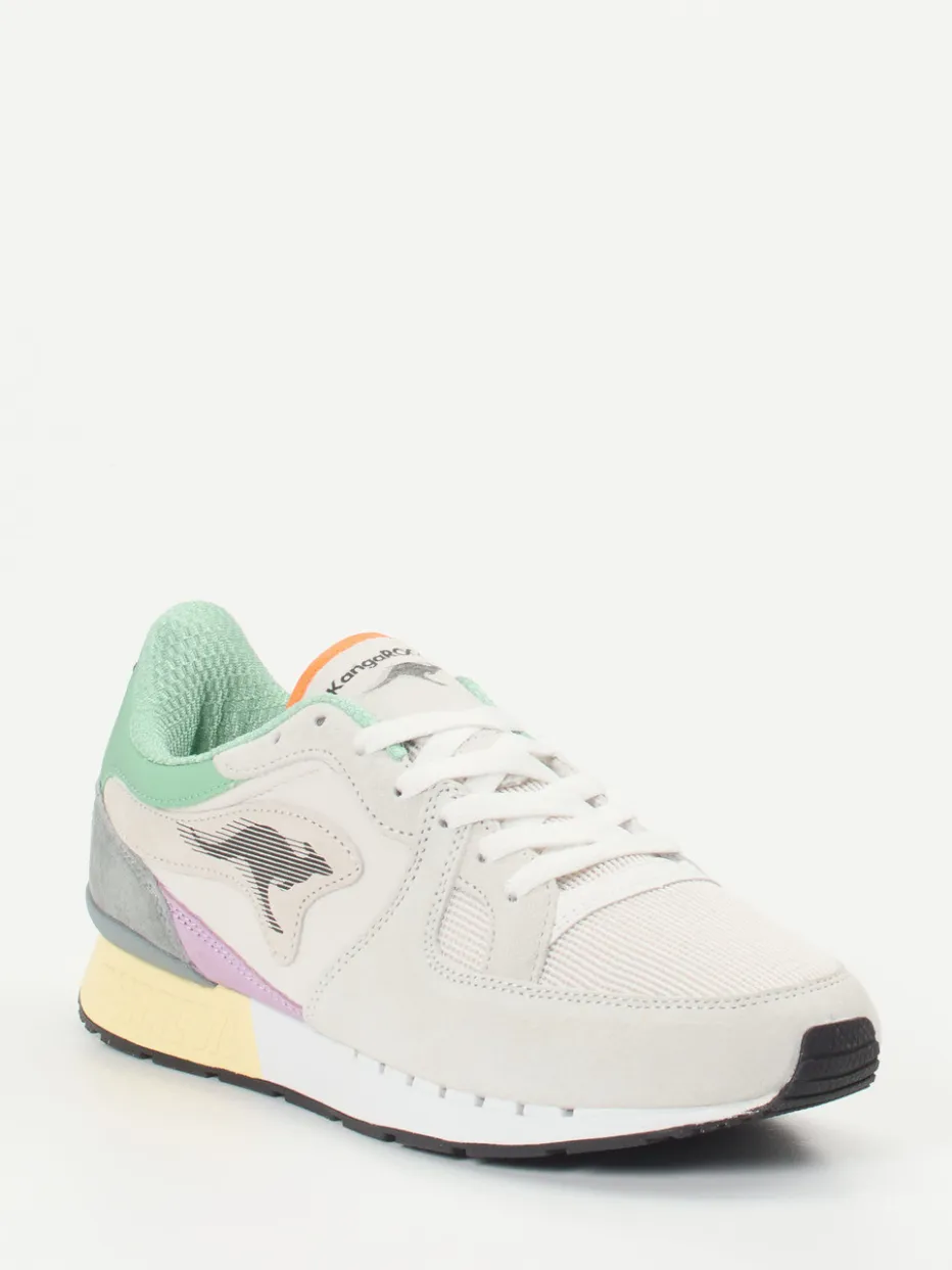 Pastelle, Retro-Flair, Komfort.Kangaroos präsentiert mit diesem Sneaker ein Modell der Kategorie Retro-Runner mit stilvoller Neuinterpretation. Ideal für urbane Freizeitaktivitäten verknüpft der Schuh weiches Meshtextil mit samtig angeschliffenem Veloursleder. Hellbeige dominiert das Design, ergänzt durch dynamische Farbakzente in Mintgrün, Orange und Lavendel. Die klassische Runner-Form mit gepolstertem Schaft, farbiger Zwischensohle und markanter Logostickerei orientiert sich am Vintage-Stil der 90er, während die Dynacoil-Technologie eine komfortable Dämpfung garantiert. Ein vielseitiger Unisex-Sneaker für trendorientierte Looks mit sportivem Anspruch.