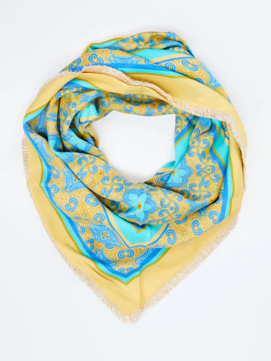 Ein quadratisches Tuch mit Boho-Flair und mediterranen Farben – ideal für den Sommerlook zwischen City und Strand.