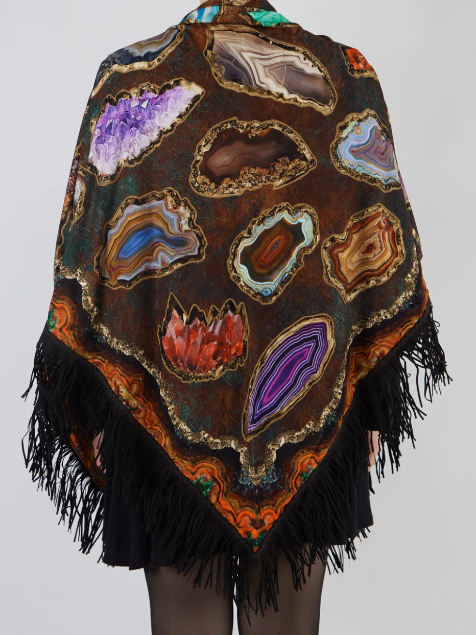 Boho-Stil mit Edelstein-Facette. Katherina Loretta bringt mit diesem Damen-Poncho stilvolle Lässigkeit ins Outfit-Spiel. Ideal für entspannte Spaziergänge oder den nächsten Kurztrip: Das großformatige Umschlagtuch aus weichem Textil zeigt einen auffälligen Edelstein-Print mit matt schimmernder Oberfläche. Das dunkelbraune Farbspektrum wird durch orange und violette Akzente lebendig ergänzt. Der offene Schnitt mit dreieckiger Silhouette fällt locker über die Schultern, eingefasst von langen Fransen und feinen goldfarbenen Konturen im Dessin. Inspiriert von Boho- und Vintage-70s-Trends passt dieses Tuch hervorragend zu schlichten Kleidern und auffälligem Schmuck. Ein markentypisches Accessoire für trendorientierte Looks mit entspanntem Charakter.