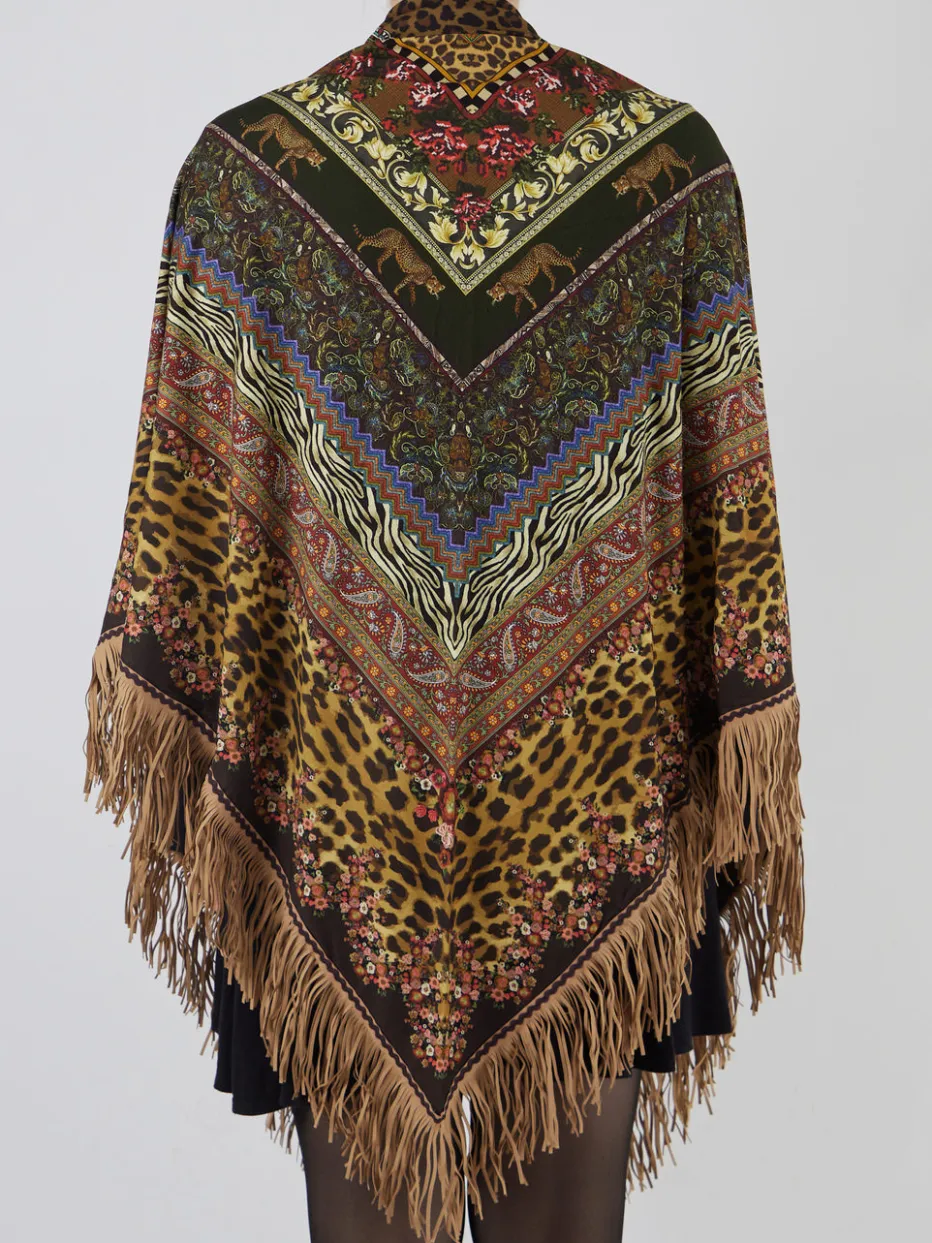 Der Poncho-Schal von Katherina Loretta bringt mit seinem ausdrucksstarken Mix aus Animalprint, floralen Elementen und langen Fransen herbstlichen Boho-Flair in jede Garderobe.