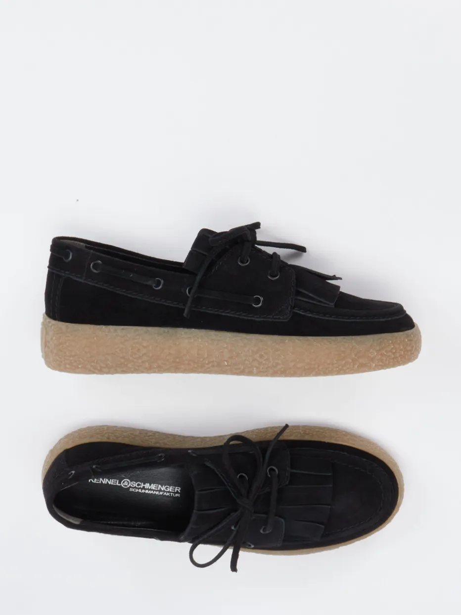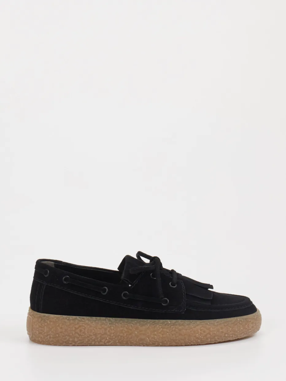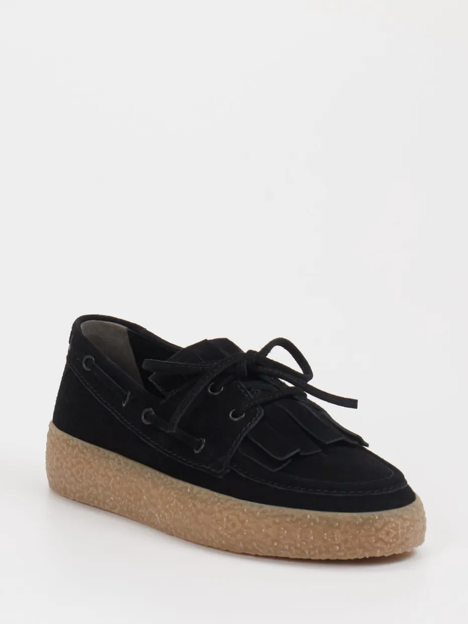 Modisch reduzierter Damen-Bootsschuh mit Fransen-Detail, weicher Kreppsohle und schwarzem Veloursleder – inspiriert von Preppy-Looks und dem Trend ‚Quiet Luxury‘.