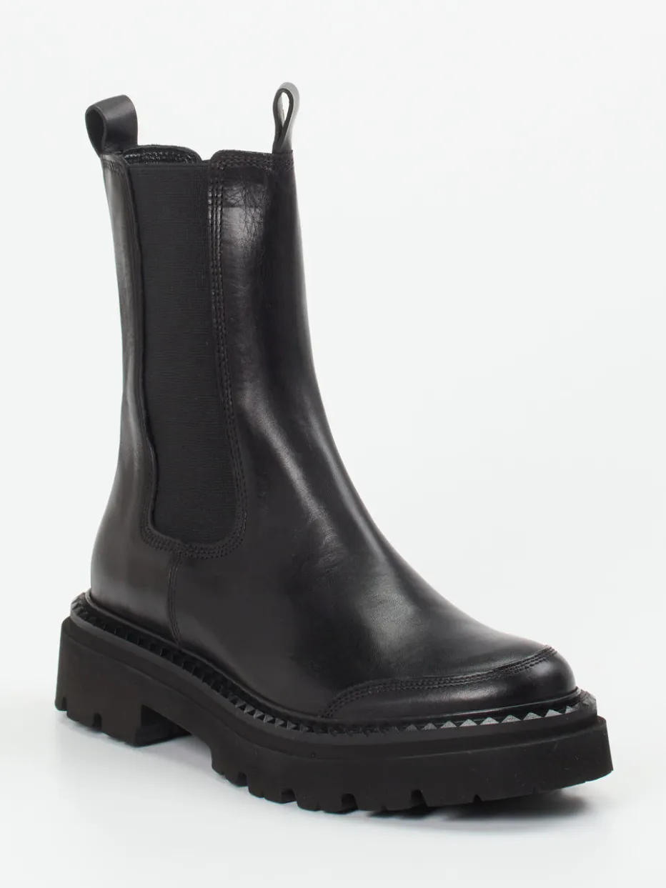 Moderner Klassiker mit Kante.Kennel & Schmenger präsentiert einen Chelsea Boot der besonderen Art. Die Damen-Stiefelette überzeugt durch glänzendes schwarzes Kalbleder, ergänzt durch elastische Einsätze und einen klassischen hohen Schaft. Zuglaschen, ein gezackter Nietenrand und die betont chunky gestaltete Profilsohle setzen stilistische Akzente, perfekt im Einklang mit dem aktuellen Heavy-Sole-Trend und der Ästhetik von Quiet Luxury. Die bequeme Innensohle sorgt für angenehmen Tragekomfort im Alltag sowie im Büro. Kombiniert zu Oversize-Coats entsteht ein harmonischer Streetstyle-Look. Eleganz und Funktion verschmelzen hier zu urbaner Modernität mit Substanz.