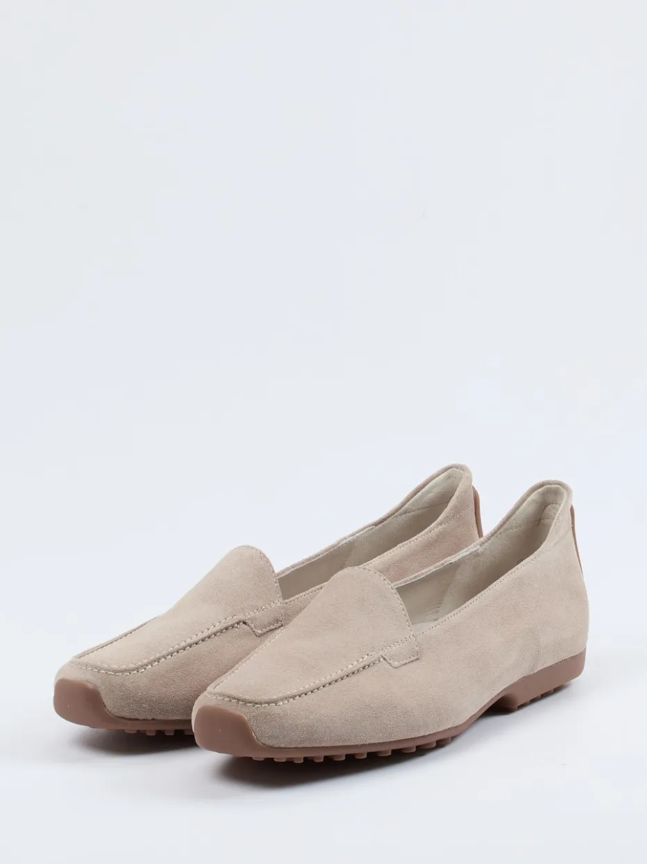 Ein Damen-Loafer mit minimalistischem Anspruch: Gefertigt aus softem Veloursleder in edlem Beigegrau und ausgestattet mit strukturierter Gummisohle für einen alltagstauglich-luxuriösen Auftritt.