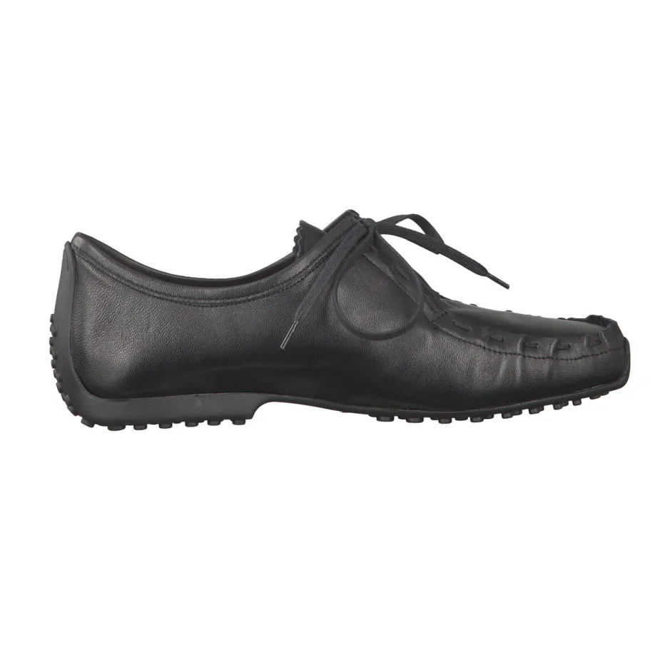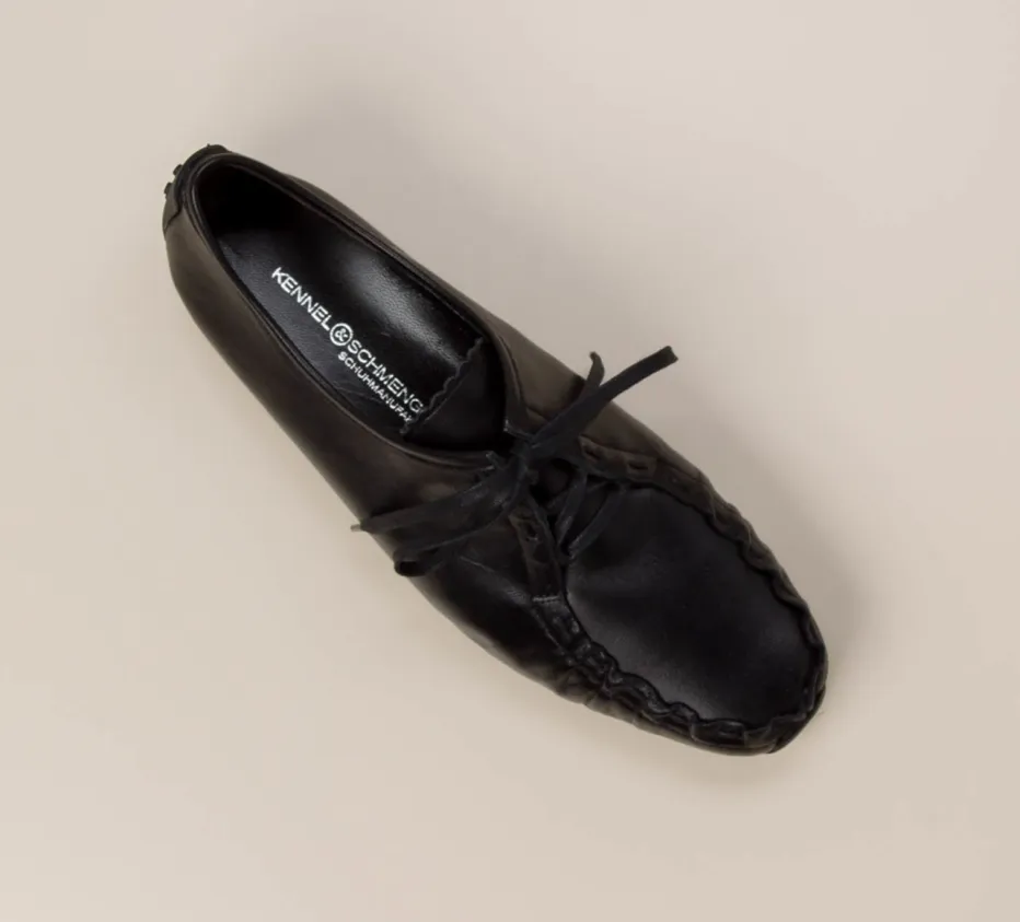 Einen hoch angeschlossenen, aber durchaus femininen Schnürschuh zeigt die Marke Kennel & Schmenger. Er besticht durch das besonders weiche, schwarze Kalbleder. Ein besonderes Detail ist die unkonventionelle Mokassinnaht, sie wirkt neu und vermittelt lässige Sportlichkeit. Die schwarze, genoppte Gummisohle ist im Stil der Autofahrersohlen an der Ferse hochgezogen. Absolute Bequemlichkeit ist eine Selbstverständlichkeit bei diesem Schnürschuh.