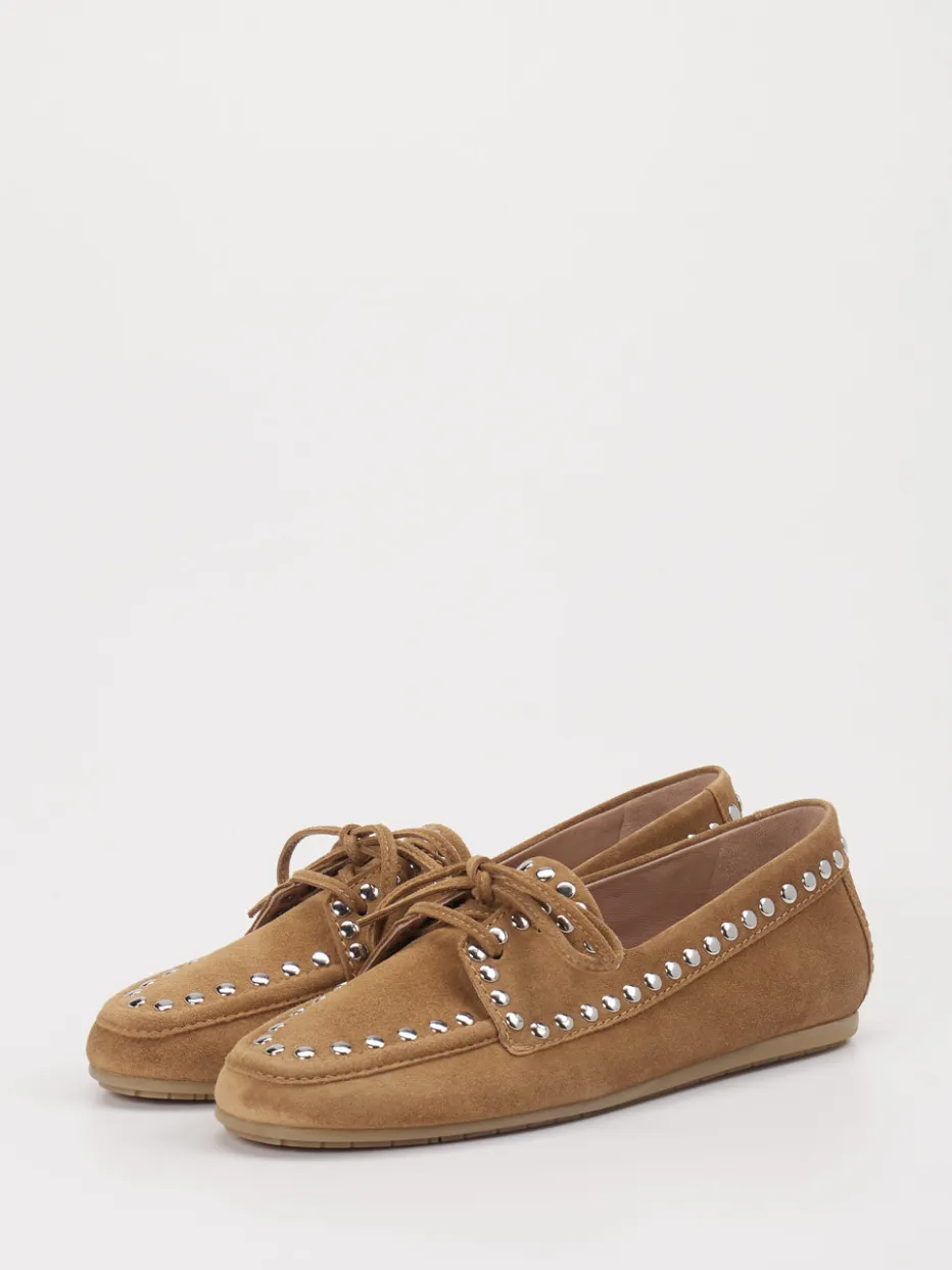 Weiches Veloursleder, silberfarbene Nieten und eine klassische Silhouette verleihen diesem Mokassin modernen Chic mit dezentem Glamour.