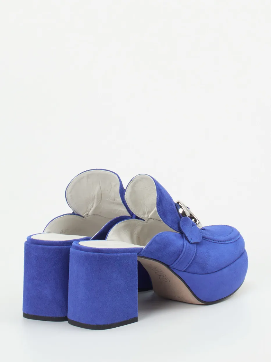 Diese ausdrucksstarken Plateau-Mules verbinden hochwertiges Veloursleder mit markanten 70s-Elementen und stehen stellvertretend für das Y2K-Revival.